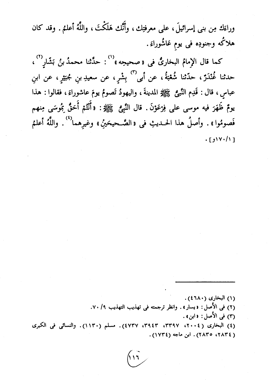 كَمَا قَالَ الْإِمَامُ الْبُخَارِيُّ فِي " صَحِيحِهِ ": حَدَّثَنَا مُحَمَّدُ بْنُ بَشَّارٍ، حَدَّثَنَا غُنْدَرٌ، حَدَّثَنَا شُعْبَةُ، عَنْ أَبِي بِشْرٍ، عَنْ سَعِيدِ بْنِ جُبَيْرٍ، عَنِ ابْنِ عَبَّاسٍ، قَالَ: قَدِمَ النَّبِيُّ صَلَّى اللَّهُ عَلَيْهِ وَسَلَّمَ الْمَدِينَةَ وَالْيَهُودُ تَصُومُ يَوْمَ عَاشُورَاءَ، فَقَالُوا: هَذَا يَوْمٌ ظَهَرَ فِيهِ مُوسَى عَلَى فِرْعَوْنَ. قَالَ النَّبِيُّ صَلَّى اللَّهُ عَلَيْهِ وَسَلَّمَ: «أَنْتُمْ أَحَقُّ بِمُوسَى مِنْهُمْ فَصُومُوا» وَأَصْلُ هَذَا الْحَدِيثِ فِي " الصَّحِيحَيْنِ " وَغَيْرِهِمَا. وَاللَّهُ أَعْلَمُ.