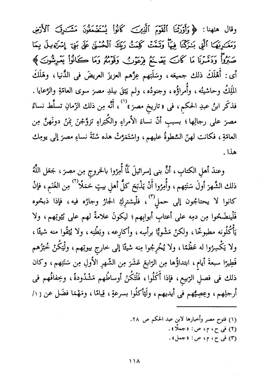 وَقَالَ هَاهُنَا: {وَأَوْرَثْنَا الْقَوْمَ الَّذِينَ كَانُوا يُسْتَضْعَفُونَ مَشَارِقَ الْأَرْضِ وَمَغَارِبَهَا الَّتِي بَارَكْنَا فِيهَا وَتَمَّتْ كَلِمَةُ رَبِّكَ الْحُسْنَى عَلَى بَنِي إِسْرَائِيلَ بِمَا صَبَرُوا وَدَمَّرْنَا مَا كَانَ يَصْنَعُ فِرْعَوْنُ وَقَوْمُهُ وَمَا كَانُوا يَعْرِشُونَ} [الأعراف: 137] أَيْ: أَهْلَكَ ذَلِكَ جَمِيعَهُ، وَسَلَبَهُمْ عِزَّهُمُ الْعَزِيزَ الْعَرِيضَ فِي الدُّنْيَا، وَهَلَكَ الْمَلِكُ وَحَاشِيَتُهُ، وَأُمَرَاؤُهُ، وَجُنُودُهُ، وَلَمْ يَبْقَ بِبَلَدِ مِصْرَ سِوَى الْعَامَّةِ وَالرَّعَايَا. فَذَكَرَ ابْنُ عَبْدِ الْحَكَمِ، فِي " تَارِيخِ مِصْرَ "، أَنَّهُ مِنْ ذَلِكَ الزَّمَانِ تَسَلَّطَ نِسَاءُ مِصْرَ عَلَى رِجَالِهَا; بِسَبَبِ أَنَّ نِسَاءَ الْأُمَرَاءِ وَالْكُبَرَاءِ تَزَوَّجْنَ بِمَنْ دُونَهُنَّ مِنَ الْعَامَّةِ فَكَانَتْ لَهُنَّ السَّطْوَةُ عَلَيْهِمْ وَاسْتَمَرَّتْ هَذِهِ سُنَّةَ نِسَاءِ مِصْرَ إِلَى يَوْمِكَ هَذَا.
