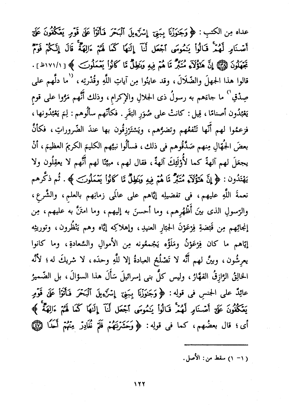 عَدَاهُ مِنَ الْكُتُبِ: {وَجَاوَزْنَا بِبَنِي إِسْرَائِيلَ الْبَحْرَ فَأَتَوْا عَلَى قَوْمٍ يَعْكُفُونَ عَلَى أَصْنَامٍ لَهُمْ قَالُوا يَا مُوسَى اجْعَلْ لَنَا إِلَهًا كَمَا لَهُمْ آلِهَةٌ قَالَ إِنَّكُمْ قَوْمٌ تَجْهَلُونَ - إِنَّ هَؤُلَاءِ مُتَبَّرٌ مَا هُمْ فِيهِ وَبَاطِلٌ مَا كَانُوا يَعْمَلُونَ} [الأعراف: 138 - 139] قَالُوا هَذَا الْجَهْلَ وَالضَّلَالَ، وَقَدْ عَايَنُوا مِنْ آيَاتِ اللَّهِ وَقُدْرَتِهِ، مَا دَلَّهُمْ عَلَى صِدْقِ مَا جَاءَهُمْ بِهِ رَسُولُ ذِي الْجَلَالِ وَالْإِكْرَامِ، وَذَلِكَ أَنَّهُمْ مَرُّوا عَلَى قَوْمٍ يَعْبُدُونَ أَصْنَامًا، قِيلَ: كَانَتْ عَلَى صُوَرِ الْبَقَرِ. فَكَأَنَّهُمْ سَأَلُوهُمْ: لِمَ يَعْبُدُونَهَا، فَزَعَمُوا لَهُمْ أَنَّهَا تَنْفَعُهُمْ وَتَضُرُّهُمْ، وَيَسْتَرْزِقُونَ بِهَا عِنْدَ الضَّرُورَاتِ، فَكَأَنَّ بَعْضَ الْجُهَّالِ مِنْهُمْ صَدَّقُوهُمْ فِي ذَلِكَ، فَسَأَلُوا نَبِيَّهُمُ الْكَلِيمَ الْكَرِيمَ الْعَظِيمَ، أَنْ يَجْعَلَ لَهُمْ آلِهَةً كَمَا لِأُولَئِكَ آلِهَةٌ، فَقَالَ لَهُمْ مُبَيِّنًا لَهُمْ أَنَّهُمْ لَا يَعْقِلُونَ وَلَا يَهْتَدُونَ: {إِنَّ هَؤُلَاءِ مُتَبَّرٌ مَا هُمْ فِيهِ وَبَاطِلٌ مَا كَانُوا يَعْمَلُونَ} [الأعراف: 139] . ثُمَّ ذَكَّرَهُمْ نِعْمَةَ اللَّهِ عَلَيْهِمْ، فِي تَفْضِيلِهِ إِيَّاهُمْ عَلَى عَالِمِي زَمَانِهِمْ بِالْعِلْمِ، وَالشَّرْعِ، وَالرَّسُولِ الَّذِي بَيْنَ أَظْهُرِهِمْ، وَمَا أَحْسَنَ بِهِ إِلَيْهِمْ، وَمَا امْتَنَّ بِهِ عَلَيْهِمْ، مِنْ إِنْجَائِهِمْ مِنْ قَبْضَةِ فِرْعَوْنَ الْجَبَّارِ الْعَنِيدِ، وَإِهْلَاكِهِ إِيَّاهُ وَهُمْ يَنْظُرُونَ، وَتَوْرِيثِهِ إِيَّاهُمْ مَا كَانَ فِرْعَوْنُ وَمَلَؤُهُ يَجْمَعُونَهُ مِنَ الْأَمْوَالِ وَالسَّعَادَةِ، وَمَا كَانُوا يَعْرِشُونَ، وَبَيَّنَ لَهُمْ أَنَّهُ لَا تَصْلُحُ الْعِبَادَةُ إِلَّا لِلَّهِ وَحْدَهُ، لَا شَرِيكَ لَهُ; لِأَنَّهُ الْخَالِقُ الرَّازِقُ الْقَهَّارُ، وَلَيْسَ كُلُّ بَنِي إِسْرَائِيلَ سَأَلَ هَذَا السُّؤَالَ، بَلِ الضَّمِيرُ عَائِدٌ عَلَى الْجِنْسِ فِي قَوْلِهِ: {وَجَاوَزْنَا بِبَنِي إِسْرَائِيلَ الْبَحْرَ فَأَتَوْا عَلَى قَوْمٍ يَعْكُفُونَ عَلَى أَصْنَامٍ لَهُمْ قَالُوا يَامُوسَى اجْعَلْ لَنَا إِلَهًا كَمَا لَهُمْ آلِهَةٌ} [الأعراف: 138] أَيْ; قَالَ بَعْضُهُمْ كَمَا فِي قَوْلِهِ: