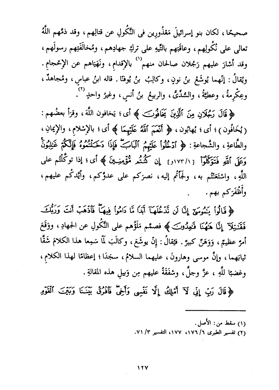 {قَالَ رَجُلَانِ مِنَ الَّذِينَ يَخَافُونَ} [المائدة: 23] أَيْ; يَخَافُونَ اللَّهَ وَقَرَأَ بَعْضُهُمْ: (يُخَافُونَ) ; أَيْ يُهَابُونَ، {أَنْعَمَ اللَّهُ عَلَيْهِمَا} [المائدة: 23] أَيْ; بِالْإِسْلَامِ، وَالْإِيمَانِ، وَالطَّاعَةِ، وَالشَّجَاعَةِ: {ادْخُلُوا عَلَيْهِمُ الْبَابَ فَإِذَا دَخَلْتُمُوهُ فَإِنَّكُمْ غَالِبُونَ وَعَلَى اللَّهِ فَتَوَكَّلُوا إِنْ كُنْتُمْ مُؤْمِنِينَ} [المائدة: 23] أَيْ; إِذَا تَوَكَّلْتُمْ عَلَى اللَّهِ، وَاسْتَعَنْتُمْ بِهِ، وَلَجَأْتُمْ إِلَيْهِ، نَصَرَكُمْ عَلَى عَدُوِّكُمْ، وَأَيَّدَكُمْ عَلَيْهِمْ، وَأَظْفَرَكُمْ بِهِمْ.