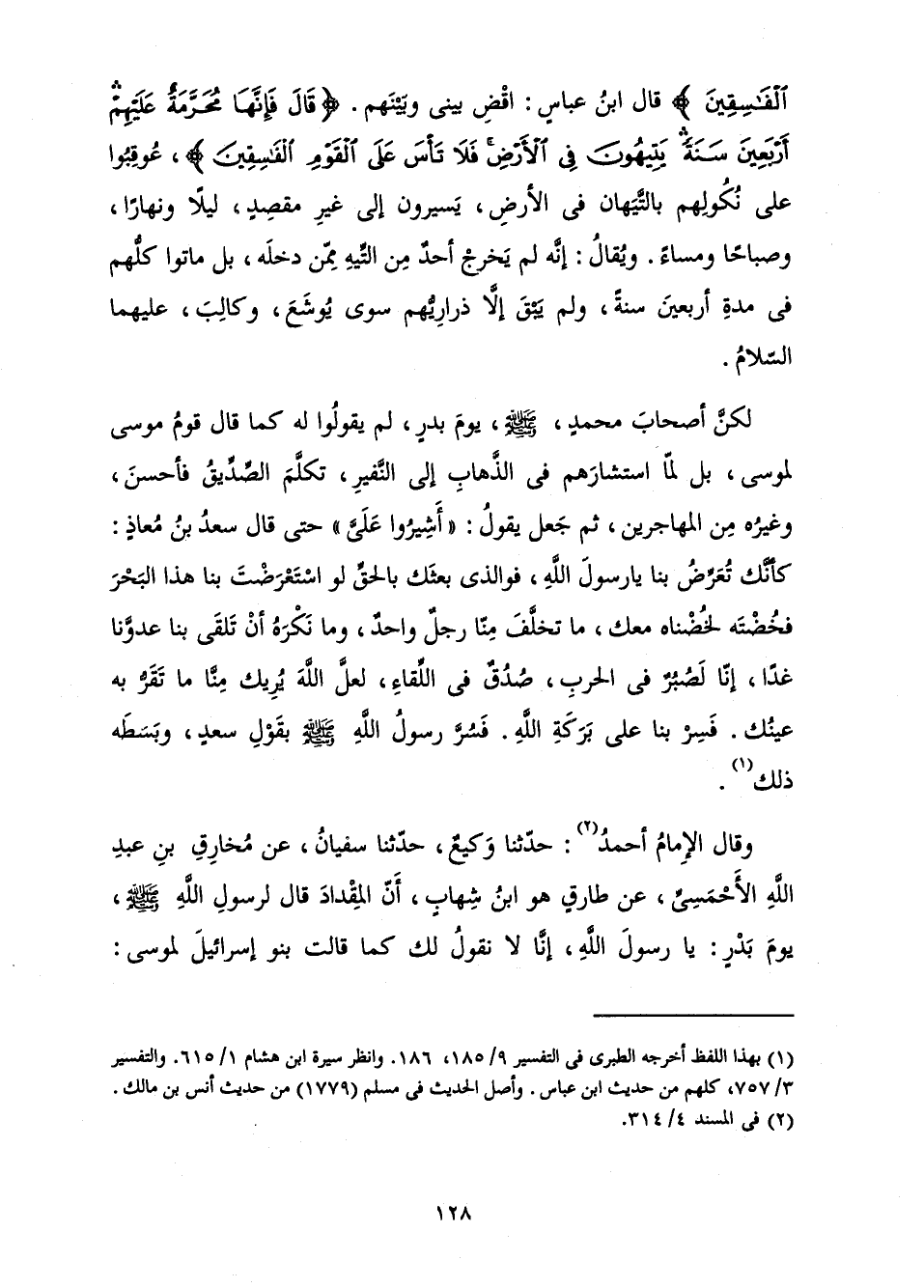 لَكِنَّ أَصْحَابَ مُحَمَّدٍ، صَلَّى اللَّهُ عَلَيْهِ وَسَلَّمَ، يَوْمَ بَدْرٍ، لَمْ يَقُولُوا لَهُ كَمَا قَالَ قَوْمُ مُوسَى لِمُوسَى، بَلْ لَمَّا اسْتَشَارَهُمْ فِي الذَّهَابِ إِلَى النَّفِيرِ، تَكَلَّمَ الصِّدِّيقُ فَأَحْسَنَ، وَغَيْرُهُ مِنَ الْمُهَاجِرِينَ، ثُمَّ جَعَلَ يَقُولُ: «أَشِيرُوا عَلَيَّ حَتَّى قَالَ سَعْدُ بْنُ مُعَاذٍ: كَأَنَّكَ تُعَرِّضُ بِنَا يَا رَسُولَ اللَّهِ، فَوَالَّذِي بَعَثَكَ بِالْحَقِّ لَوِ اسْتَعْرَضْتَ بِنَا هَذَا الْبَحْرَ فَخُضْتَهُ لَخُضْنَاهُ مَعَكَ، مَا تَخَلَّفَ مِنَّا رَجُلٌ وَاحِدٌ، وَمَا نَكْرَهُ أَنْ يَلْقَى بِنَا عَدُوَّنَا غَدًا، إِنَّا لَصُبُرٌ فِي الْحَرْبِ صُدُقٌ فِي اللِّقَاءِ، لَعَلَّ اللَّهَ يُرِيكَ مِنَّا مَا تَقَرُّ بِهِ عَيْنُكَ. فَسِرْ بِنَا عَلَى بَرَكَةِ اللَّهِ. فَسُرَّ رَسُولُ اللَّهِ صَلَّى اللَّهُ عَلَيْهِ وَسَلَّمَ بِقَوْلِ سَعْدٍ، وَبَسَطَهُ ذَلِكَ.»
