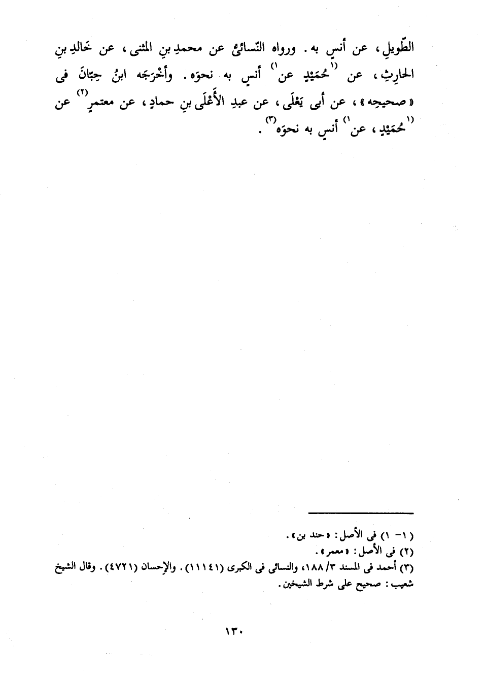 الطَّوِيلِ، عَنْ أَنَسٍ بِهِ. وَرَوَاهُ النَّسَائِيُّ عَنْ مُحَمَّدِ بْنِ الْمُثَنَّى، عَنْ خَالِدِ بْنِ الْحَارِثِ، عَنْ حُمَيْدٍ، عَنْ أَنَسٍ بِهِ نَحْوَهُ. وَأَخْرَجَهُ ابْنُ حِبَّانَ فِي " صَحِيحِهِ "، عَنْ أَبِي يَعْلَى، عَنْ عَبْدِ الْأَعْلَى بْنِ حَمَّادٍ، عَنْ مُعْتَمِرٍ عَنْ حُمَيْدٍ، عَنْ أَنَسٍ بِهِ نَحْوَهُ.
