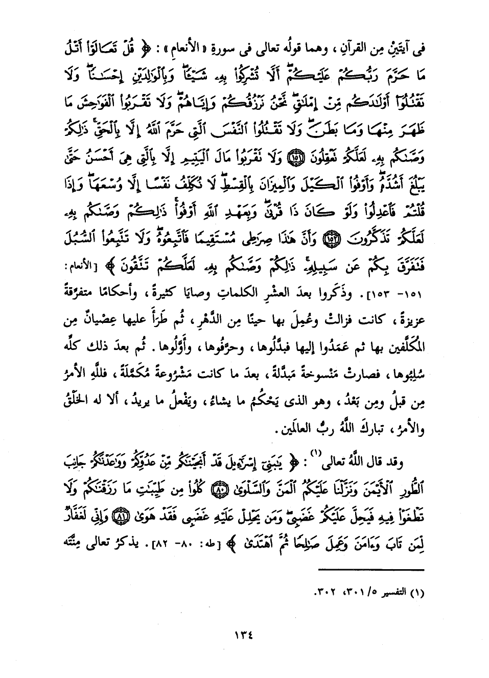 فِي آيَتَيْنِ مِنَ الْقُرْآنِ، وَهُمَا قَوْلُهُ تَعَالَى فِي سُورَةِ " الْأَنْعَامِ " {قُلْ تَعَالَوْا أَتْلُ مَا حَرَّمَ رَبُّكُمْ عَلَيْكُمْ أَلَّا تُشْرِكُوا بِهِ شَيْئًا وَبِالْوَالِدَيْنِ إِحْسَانًا وَلَا تَقْتُلُوا أَوْلَادَكُمْ مِنْ إِمْلَاقٍ نَحْنُ نَرْزُقُكُمْ وَإِيَّاهُمْ وَلَا تَقْرَبُوا الْفَوَاحِشَ مَا ظَهَرَ مِنْهَا وَمَا بَطَنَ وَلَا تَقْتُلُوا النَّفْسَ الَّتِي حَرَّمَ اللَّهُ إِلَّا بِالْحَقِّ ذَلِكُمْ وَصَّاكُمْ بِهِ لَعَلَّكُمْ تَعْقِلُونَ - وَلَا تَقْرَبُوا مَالَ الْيَتِيمِ إِلَّا بِالَّتِي هِيَ أَحْسَنُ حَتَّى يَبْلُغَ أَشُدَّهُ وَأَوْفُوا الْكَيْلَ وَالْمِيزَانَ بِالْقِسْطِ لَا نُكَلِّفُ نَفْسًا إِلَّا وُسْعَهَا وَإِذَا قُلْتُمْ فَاعْدِلُوا وَلَوْ كَانَ ذَا قُرْبَى وَبِعَهْدِ اللَّهِ أَوْفُوا ذَلِكُمْ وَصَّاكُمْ بِهِ لَعَلَّكُمْ تَذَكَّرُونَ - وَأَنَّ هَذَا صِرَاطِي مُسْتَقِيمًا فَاتَّبِعُوهُ وَلَا تَتَّبِعُوا السُّبُلَ فَتَفَرَّقَ بِكُمْ عَنْ سَبِيلِهِ ذَلِكُمْ وَصَّاكُمْ بِهِ لَعَلَّكُمْ تَتَّقُونَ} [الأنعام: 151 - 153]