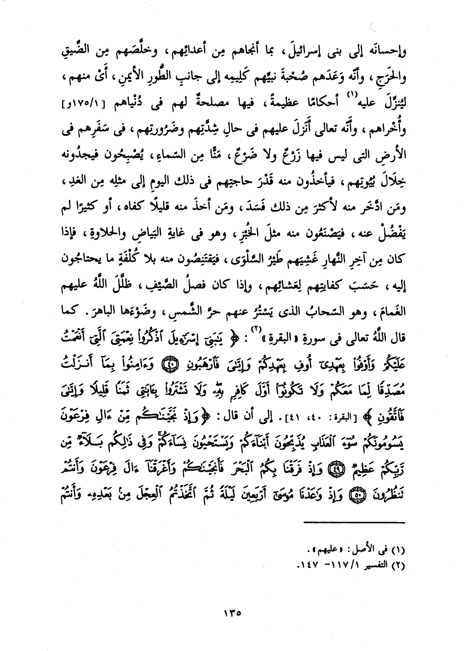 [الْبَقَرَةِ: 40، 41] . إِلَى أَنْ قَالَ: {وَإِذْ نَجَّيْنَاكُمْ مِنْ آلِ فِرْعَوْنَ يَسُومُونَكُمْ سُوءَ الْعَذَابِ يُذَبِّحُونَ أَبْنَاءَكُمْ وَيَسْتَحْيُونَ نِسَاءَكُمْ وَفِي ذَلِكُمْ بَلَاءٌ مِنْ رَبِّكُمْ عَظِيمٌ - وَإِذْ فَرَقْنَا بِكُمُ الْبَحْرَ فَأَنْجَيْنَاكُمْ وَأَغْرَقْنَا آلَ فِرْعَوْنَ وَأَنْتُمْ تَنْظُرُونَ - وَإِذْ وَاعَدْنَا مُوسَى أَرْبَعِينَ لَيْلَةً ثُمَّ اتَّخَذْتُمُ الْعِجْلَ مِنْ بَعْدِهِ وَأَنْتُمْ ظَالِمُونَ - ثُمَّ عَفَوْنَا عَنْكُمْ مِنْ بَعْدِ ذَلِكَ لَعَلَّكُمْ تَشْكُرُونَ - وَإِذْ آتَيْنَا مُوسَى الْكِتَابَ وَالْفُرْقَانَ لَعَلَّكُمْ تَهْتَدُونَ - وَإِذْ قَالَ مُوسَى لِقَوْمِهِ يَا قَوْمِ إِنَّكُمْ ظَلَمْتُمْ أَنْفُسَكُمْ بِاتِّخَاذِكُمُ الْعِجْلَ فَتُوبُوا إِلَى بَارِئِكُمْ فَاقْتُلُوا أَنْفُسَكُمْ ذَلِكُمْ خَيْرٌ لَكُمْ عِنْدَ بَارِئِكُمْ فَتَابَ عَلَيْكُمْ إِنَّهُ هُوَ التَّوَّابُ الرَّحِيمُ - وَإِذْ قُلْتُمْ يَا مُوسَى لَنْ نُؤْمِنَ لَكَ حَتَّى نَرَى اللَّهَ جَهْرَةً فَأَخَذَتْكُمُ الصَّاعِقَةُ وَأَنْتُمْ تَنْظُرُونَ - ثُمَّ بَعَثْنَاكُمْ مِنْ بَعْدِ مَوْتِكُمْ لَعَلَّكُمْ تَشْكُرُونَ - وَظَلَّلْنَا عَلَيْكُمُ الْغَمَامَ وَأَنْزَلْنَا عَلَيْكُمُ الْمَنَّ وَالسَّلْوَى كُلُوا مِنْ طَيِّبَاتِ مَا رَزَقْنَاكُمْ وَمَا ظَلَمُونَا وَلَكِنْ كَانُوا أَنْفُسَهُمْ يَظْلِمُونَ} [البقرة: 49 - 57]