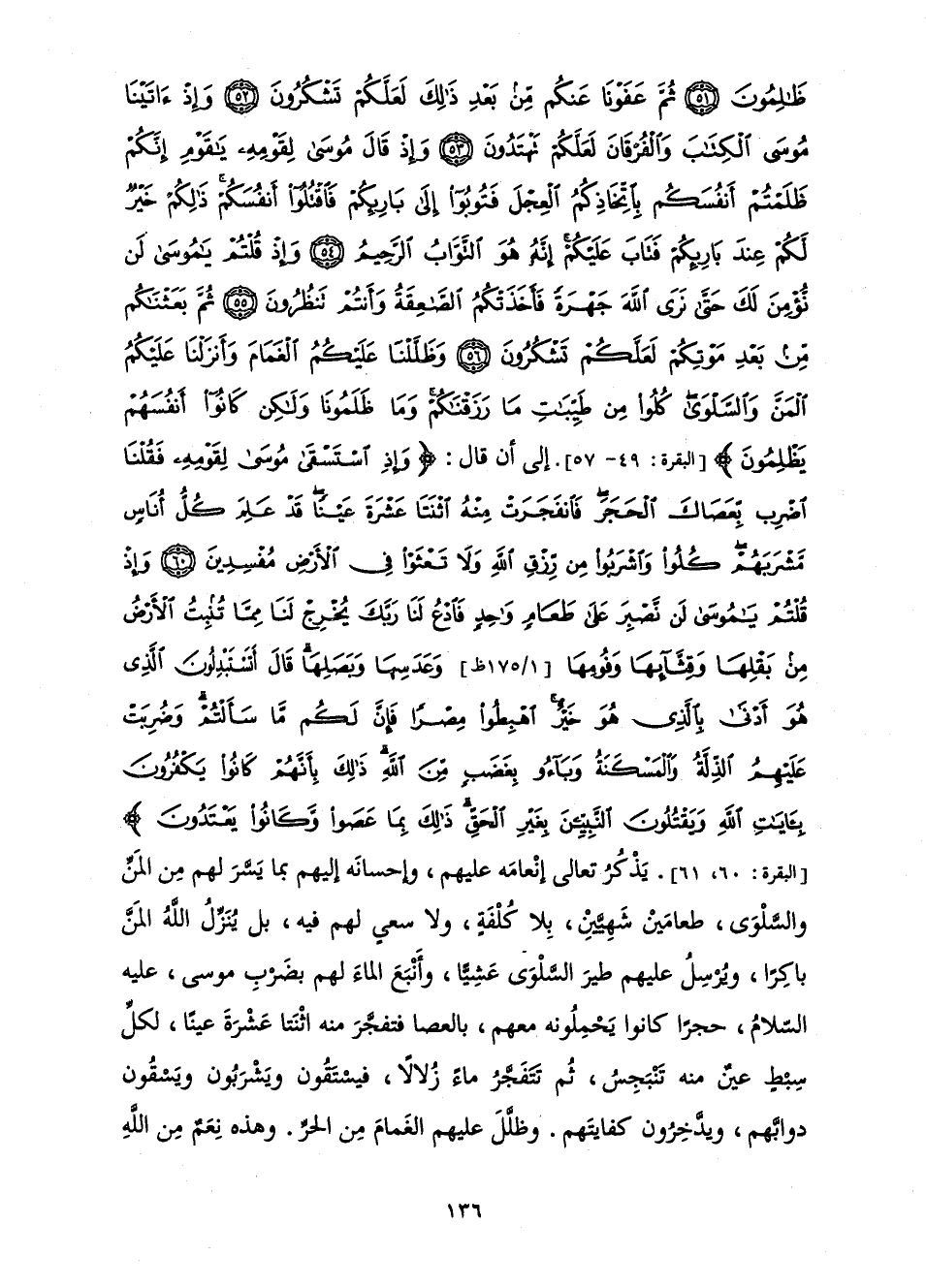 [الْبَقَرَةِ: 60، 61] . يَذْكُرُ تَعَالَى إِنْعَامَهُ عَلَيْهِمْ، وَإِحْسَانَهُ إِلَيْهِمْ بِمَا يَسَّرَ لَهُمْ مِنَ الْمَنِّ وَالسَّلْوَى طَعَامَيْنِ شَهِيَّيْنِ بِلَا كُلْفَةٍ وَلَا سَعْيٍ لَهُمْ فِيهِ، بَلْ يُنَزِّلُ اللَّهُ الْمَنَّ بَاكِرًا، وَيُرْسِلُ عَلَيْهِمْ طَيْرَ السَّلْوَى عَشِيًّا، وَأَنْبَعَ الْمَاءَ لَهُمْ بِضَرْبِ مُوسَى، عَلَيْهِ السَّلَامُ، حَجَرًا كَانُوا يَحْمِلُونَهُ مَعَهُمْ، بِالْعَصَا فَتَفَجَّرَ مِنْهُ اثْنَتَا عَشْرَةَ عَيْنًا، لِكُلِّ سِبْطٍ عَيْنٌ مِنْهُ تَنْبَجِسُ ثُمَّ تَنْفَجِرُ مَاءً زُلَالًا، فَيَسْتَقُونَ وَيَشْرَبُونَ وَيَسْقُونَ دَوَابَّهُمْ، وَيَدَّخِرُونَ كِفَايَتَهُمْ. وَظَلَّلَ عَلَيْهِمُ الْغَمَامَ مِنَ الْحَرِّ. وَهَذِهِ نِعَمٌ مِنَ اللَّهِ