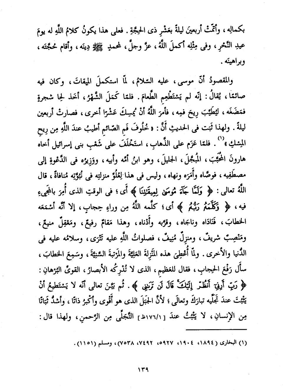 بِكَمَالِهِ، وَأُتِمَّتْ أَرْبَعِينَ لَيْلَةً بِعَشْرِ ذِي الْحِجَّةِ. فَعَلَى هَذَا يَكُونُ كَلَامُ اللَّهِ لَهُ يَوْمَ عِيدِ النَّحْرِ، وَفِي مِثْلِهِ أَكْمَلَ اللَّهُ عَزَّ وَجَلَّ لِمُحَمَّدٍ صَلَّى اللَّهُ عَلَيْهِ وَسَلَّمَ دِينَهُ، وَأَقَامَ حُجَّتَهُ وَبَرَاهِينَهُ.
