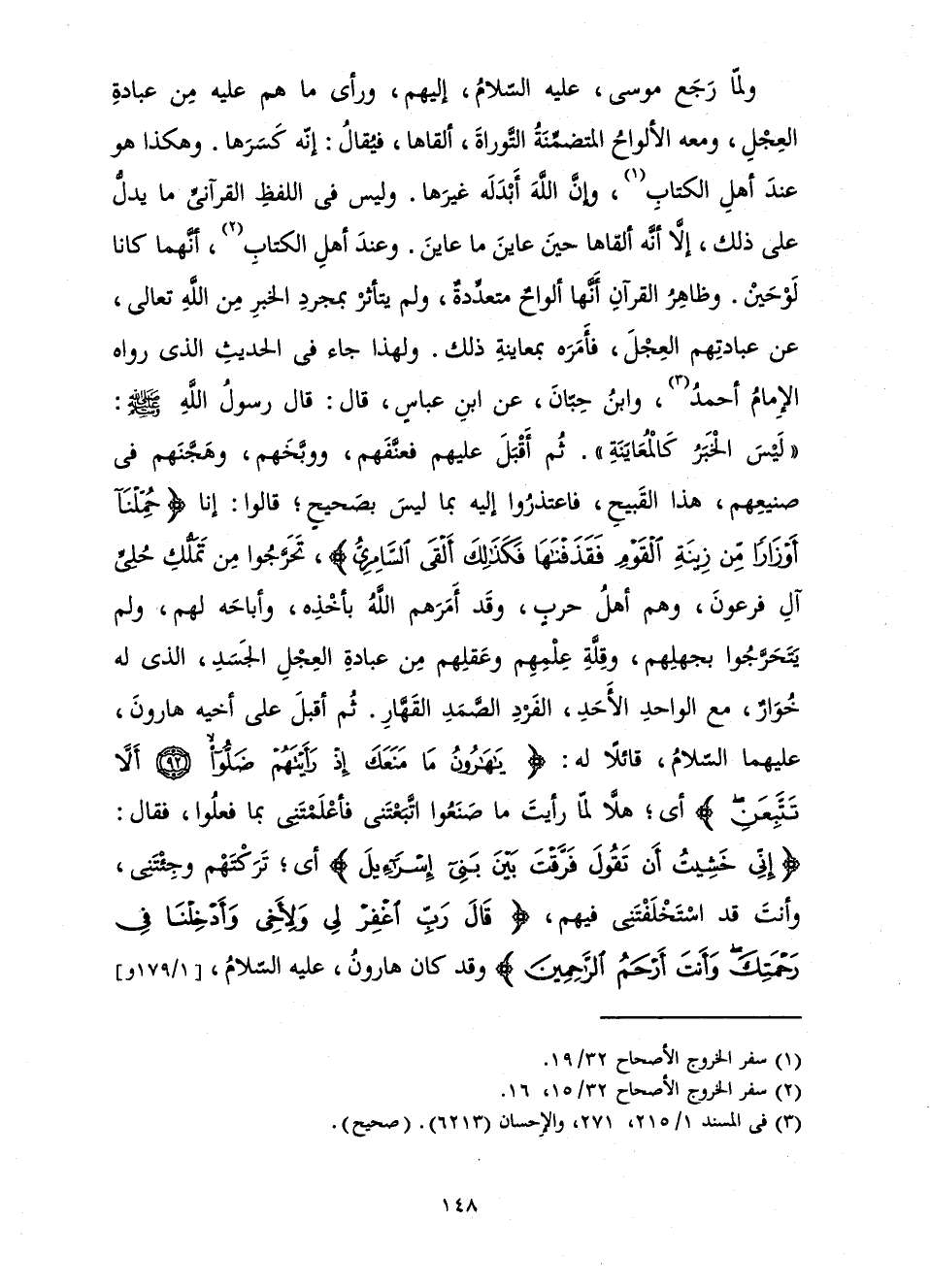 وَلَمَّا رَجَعَ مُوسَى، عَلَيْهِ السَّلَامُ، إِلَيْهِمْ، وَرَأَى مَا هُمْ عَلَيْهِ مِنْ عِبَادَةِ الْعِجْلِ، وَمَعَهُ الْأَلْوَاحُ الْمُتَضَمِّنَةُ التَّوْرَاةَ، أَلْقَاهَا، فَيُقَالُ: إِنَّهُ كَسَرَهَا. وَهَكَذَا هُوَ عِنْدَ أَهْلِ الْكِتَابِ، وَإِنَّ اللَّهَ أَبْدَلَهُ غَيْرَهَا. وَلَيْسَ فِي اللَّفْظِ الْقُرْآنِيِّ مَا يَدُلُّ عَلَى ذَلِكَ، إِلَّا أَنَّهُ أَلْقَاهَا حِينَ عَايَنَ مَا عَايَنَ. وَعِنْدَ أَهْلِ الْكِتَابِ، أَنَّهُمَا كَانَا لَوْحَيْنِ. وَظَاهِرُ الْقُرْآنِ أَنَّهَا أَلْوَاحٌ مُتَعَدِّدَةٌ، وَلَمْ يَتَأَثَّرْ بِمُجَرَّدِ الْخَبَرِ مِنَ اللَّهِ تَعَالَى، عَنْ عِبَادَةِ الْعِجْلِ، فَأَمَرَهُ بِمُعَايَنَةِ ذَلِكَ. وَلِهَذَا جَاءَ فِي الْحَدِيثِ الَّذِي رَوَاهُ الْإِمَامُ أَحْمَدُ، وَابْنُ حِبَّانَ، عَنِ ابْنِ عَبَّاسٍ قَالَ: قَالَ رَسُولُ اللَّهِ صَلَّى اللَّهُ عَلَيْهِ وَسَلَّمَ: «لَيْسَ الْخَبَرُ كَالْمُعَايَنَةِ» . ثُمَّ أَقْبَلَ عَلَيْهِمْ فَعَنَّفَهُمْ، وَوَبَّخَهُمْ، وَهَجَّنَهُمْ فِي صَنِيعِهِمْ، هَذَا الْقَبِيحِ، فَاعْتَذَرُوا إِلَيْهِ بِمَا لَيْسَ بِصَحِيح; قَالُوا: {إِنَّا حُمِّلْنَا أَوْزَارًا مِنْ زِينَةِ الْقَوْمِ فَقَذَفْنَاهَا فَكَذَلِكَ أَلْقَى السَّامِرِيُّ} [طه: 87] تَحَرَّجُوا مِنْ تَمَلُّكِ حُلِيِّ آلِ فِرْعَوْنَ، وَهُمْ أَهْلُ حَرْبٍ، وَقَدْ أَمَرَهُمُ اللَّهُ بِأَخْذِهِ، وَأَبَاحَهُ لَهُمْ وَلَمْ يَتَحَرَّجُوا بِجَهْلِهِمْ، وَقِلَّةِ عِلْمِهِمْ وَعَقْلِهِمْ مِنْ عِبَادَةِ الْعِجْلِ الْجَسَدِ، الَّذِي لَهُ خُوَارٌ، مَعَ الْوَاحِدِ الْأَحَدِ، الْفَرْدِ الصَّمَدِ الْقَهَّارِ. ثُمَّ أَقْبَلَ عَلَى أَخِيهِ هَارُونَ، عَلَيْهِمَا السَّلَامُ، قَائِلًا لَهُ: {قَالَ يَا هَارُونُ مَا مَنَعَكَ إِذْ رَأَيْتَهُمْ ضَلُّوا - أَلَّا تَتَّبِعَنِ} [طه: 92 - 93] أَيْ; هَلَّا لَمَّا رَأَيْتَ مَا صَنَعُوا اتَّبَعْتَنِي فَأَعْلَمْتَنِي بِمَا فَعَلُوا، فَقَالَ: {إِنِّي خَشِيتُ أَنْ تَقُولَ فَرَّقْتَ بَيْنَ بَنِي إِسْرَائِيلَ} [طه: 94] أَيْ; تَرَكْتَهُمْ وَجِئْتَنِي، وَأَنْتَ قَدِ اسْتَخْلَفْتَنِي فِيهِمْ، {قَالَ رَبِّ اغْفِرْ لِي وَلِأَخِي وَأَدْخِلْنَا فِي رَحْمَتِكَ وَأَنْتَ أَرْحَمُ الرَّاحِمِينَ} [الأعراف: 151] وَقَدْ كَانَ هَارُونُ، عَلَيْهِ السَّلَامُ،