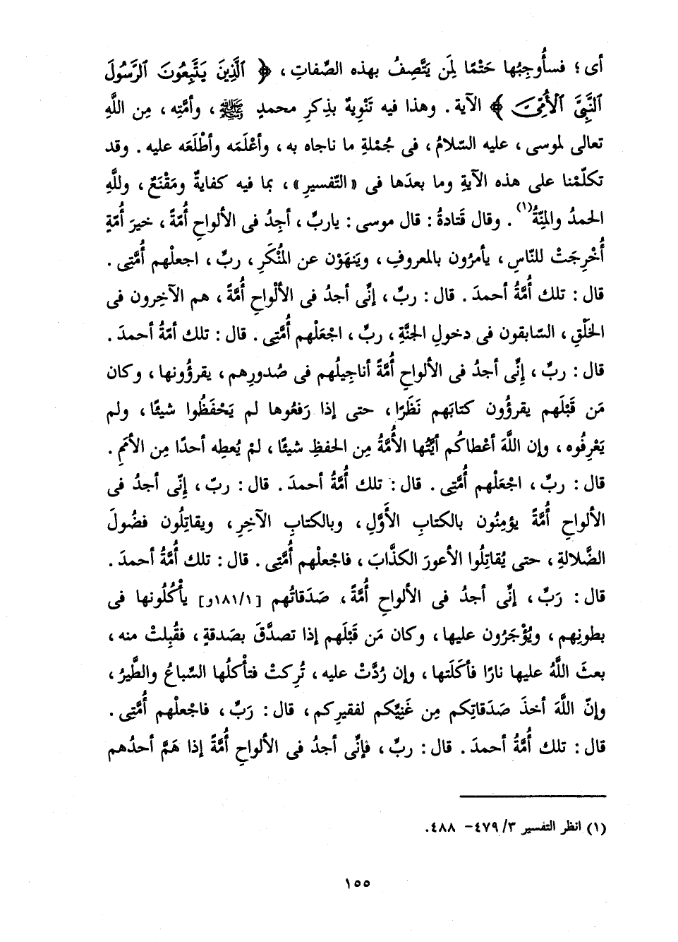 أَيْ; فَسَأُوجِبُهَا حَتْمًا لِمَنْ يَتَّصِفُ بِهَذِهِ الصِّفَاتِ، {الَّذِينَ يَتَّبِعُونَ الرَّسُولَ النَّبِيَّ الْأُمِّيَّ} [الأعراف: 157] الْآيَةَ. وَهَذَا فِيهِ تَنْوِيهٌ بِذِكْرِ مُحَمَّدٍ صَلَّى اللَّهُ عَلَيْهِ وَسَلَّمَ، وَأُمَّتِهِ، مِنَ اللَّهِ تَعَالَى لِمُوسَى، عَلَيْهِ السَّلَامُ، فِي جُمْلَةِ مَا نَاجَاهُ بِهِ، وَأَعْلَمَهُ وَأَطْلَعَهُ عَلَيْهِ. وَقَدْ تَكَلَّمْنَا عَلَى هَذِهِ الْآيَةِ وَمَا بَعْدَهَا فِي " التَّفْسِيرِ " بِمَا فِيهِ كِفَايَةٌ وَمَقْنَعٌ، وَلِلَّهِ الْحَمْدُ وَالْمِنَّةُ. وَقَالَ قَتَادَةُ: قَالَ مُوسَى: يَا رَبِّ أَجِدُّ فِي الْأَلْوَاحِ أُمَّةً، خَيْرَ أُمَّةٍ أُخْرِجَتْ لِلنَّاسِ، يَأْمُرُونَ بِالْمَعْرُوفِ، وَيَنْهَوْنَ عَنِ الْمُنْكَرِ، رَبِّ اجْعَلْهُمْ أُمَّتِي. قَالَ: تِلْكَ أُمَّةُ أَحْمَدَ. قَالَ: رَبِّ إِنِّي أَجِدُ فِي الْأَلْوَاحِ أُمَّةً، هُمُ الْآخِرُونَ فِي الْخَلْقِ، السَّابِقُونَ فِي دُخُولِ الْجَنَّةِ، رَبِّ اجْعَلْهُمْ أُمَّتِي. قَالَ: تِلْكَ أُمَّةُ أَحْمَدَ. قَالَ: رَبِّ إِنِّي أَجِدُ فِي الْأَلْوَاحِ أُمَّةً، أَنَاجِيلُهُمْ فِي صُدُورِهِمْ، يَقْرَؤُونَهَا، وَكَانَ مَنْ قَبْلَهُمْ يَقْرَؤُونَ كِتَابَهُمْ نَظَرًا، حَتَّى إِذَا رَفَعُوهَا لَمْ يَحْفَظُوا شَيْئًا وَلَمْ يَعْرِفُوهُ، وَإِنَّ اللَّهَ أَعْطَاكُمْ أَيَّتُهَا الْأُمَّةُ مِنَ الْحِفْظِ شَيْئًا، لَمْ يُعْطِهِ أَحَدًا مِنَ الْأُمَمِ. قَالَ: رَبِّ اجْعَلْهُمْ أُمَّتِي. قَالَ: تِلْكَ أُمَّةُ أَحْمَدَ. قَالَ: رَبِّ إِنِّي أَجِدُ فِي الْأَلْوَاحِ أُمَّةً، يُؤْمِنُونَ بِالْكِتَابِ الْأَوَّلِ، وَبِالْكِتَابِ الْآخِرِ، وَيُقَاتِلُونَ فُضُولَ الضَّلَالَةِ، حَتَّى يُقَاتِلُوا الْأَعْوَرَ الْكَذَّابَ، فَاجْعَلْهُمْ أُمَّتِي. قَالَ: تِلْكَ أُمَّةُ أَحْمَدَ. قَالَ: رَبِّ إِنِّي أَجِدُ فِي الْأَلْوَاحِ أُمَّةً، صَدَقَاتُهُمْ يَأْكُلُونَهَا فِي بُطُونِهِمْ، وَيُؤْجَرُونَ عَلَيْهَا، وَكَانَ مَنْ قَبْلَهُمْ إِذَا تَصَدَّقَ بِصَدَقَةٍ فَقُبِلَتْ مِنْهُ بَعْثَ اللَّهُ عَلَيْهَا نَارًا فَأَكْلَتْهَا، وَإِنْ رُدَّتْ عَلَيْهِ تُرِكَتْ فَتَأْكُلُهَا السِّبَاعُ وَالطَّيْرُ، وَإِنَّ اللَّهَ أَخَذَ صَدَقَاتِكُمْ مِنْ غَنِيِّكُمْ لِفَقِيرِكُمْ قَالَ: رَبِّ فَاجْعَلْهُمْ أُمَّتِي. قَالَ: تِلْكَ أُمَّةُ أَحْمَدَ. قَالَ: رَبِّ فَإِنِّي أَجِدُ فِي الْأَلْوَاحِ أُمَّةً، إِذَا هَمَّ أَحَدُهُمْ