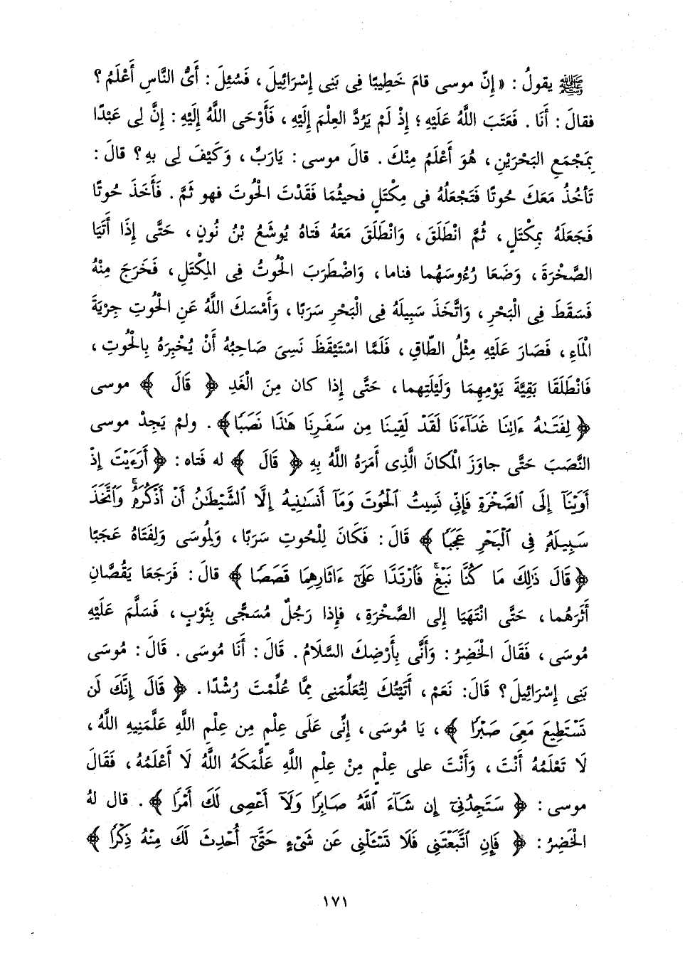 صَلَّى اللَّهُ عَلَيْهِ وَسَلَّمَ يَقُولُ «إِنَّ مُوسَى قَامَ خَطِيبًا فِي بَنِي إِسْرَائِيلَ، فَسُئِلَ: أَيُّ النَّاسِ أَعْلَمُ؟ فَقَالَ: أَنَا. فَعَتَبَ اللَّهُ عَلَيْهِ; إِذْ لَمْ يَرُدَّ الْعِلْمَ إِلَيْهِ، فَأَوْحَى اللَّهُ إِلَيْهِ، إِنَّ لِي عَبْدًا بِمَجْمَعِ الْبَحْرَيْنِ، هُوَ أَعْلَمُ مِنْكَ. قَالَ مُوسَى: يَا رَبِّ، وَكَيْفَ لِي بِهِ؟ قَالَ: تَأْخُذُ مَعَكَ حُوتًا فَتَجْعَلُهُ فِي مِكْتَلٍ فَحَيْثُمَا فَقَدْتَ الْحُوتَ فَهُوَ ثَمَّ. فَأَخَذَ حُوتًا فَجَعَلَهُ بِمِكْتَلٍ، ثُمَّ انْطَلَقَ، وَانْطَلَقَ مَعَهُ فَتَاهَ يُوشَعُ بْنُ نُونٍ، حَتَّى إِذَا أَتَيَا الصَّخْرَةَ، وَضَعَا رُءُوسَهُمَا فَنَامَا، وَاضْطَرَبَ الْحُوتَ فِي الْمِكْتَلِ، فَخَرَجَ مِنْهُ فَسَقَطَ فِي الْبَحْرِ، وَاتَّخَذَ سَبِيلَهُ فِي الْبَحْرِ سَرَبًا، وَأَمْسَكَ اللَّهُ عَنِ الْحُوتِ جَرْيَةَ الْمَاءِ، فَصَارَ عَلَيْهِ مِثْلُ الطَّاقِ، فَلَمَّا اسْتَيْقَظَ نَسِيَ صَاحِبُهُ أَنْ يُخْبِرَهُ بِالْحُوتِ، فَانْطَلَقَا بَقِيَّةَ يَوْمِهِمَا وَلَيْلَتِهِمَا، حَتَّى إِذَا كَانَ مِنَ الْغَدِ " قَالَ " مُوسَى {لِفَتَاهُ آتِنَا غَدَاءَنَا لَقَدْ لَقِينَا مِنْ سَفَرِنَا هَذَا نَصَبًا} [الكهف: 62] . وَلَمْ يَجِدْ مُوسَى النَّصَبَ حَتَّى جَاوَزَ الْمَكَانَ الَّذِي أَمَرَهُ اللَّهُ بِهِ " قَالَ " لَهُ فَتَاهَ: {أَرَأَيْتَ إِذْ أَوَيْنَا إِلَى الصَّخْرَةِ فَإِنِّي نَسِيتُ الْحُوتَ وَمَا أَنْسَانِيهُ إِلَّا الشَّيْطَانُ أَنْ أَذْكُرَهُ وَاتَّخَذَ سَبِيلَهُ فِي الْبَحْرِ عَجَبًا} [الكهف: 63] قَالَ: فَكَانَ لِلْحُوتِ سَرَبًا، وَلِمُوسَى وَلِفَتَاهُ عَجَبًا قَالَ: {ذَلِكَ مَا كُنَّا نَبْغِ فَارْتَدَّا عَلَى آثَارِهِمَا قَصَصًا} [الكهف: 64] قَالَ: فَرَجَعَا يَقُصَّانِ أَثَرَهُمَا، حَتَّى انْتَهَيَا إِلَى الصَّخْرَةِ، فَإِذَا رَجُلٌ مُسَجًّى بِثَوْبٍ، فَسَلَّمَ عَلَيْهِ مُوسَى، فَقَالَ الْخَضِرُ: وَأَنَّى بِأَرْضِكَ السَّلَامُ. قَالَ: أَنَا مُوسَى. قَالَ: مُوسَى بَنِي إِسْرَائِيلَ؟ قَالَ: نَعَمْ، أَتَيْتُكَ لِتُعَلِّمَنِي مِمَّا عُلِّمْتَ رُشْدًا. " {قَالَ إِنَّكَ لَنْ تَسْتَطِيعَ مَعِيَ صَبْرًا} [الكهف: 67] "، يَا مُوسَى، إِنِّي عَلَى عِلْمٍ مِنْ عِلْمِ اللَّهِ عَلَّمَنِيهِ اللَّهُ، لَا تَعْلَمُهُ أَنْتَ، وَأَنْتَ عَلَى عِلْمٍ مَنْ عِلْمِ اللَّهِ عَلَّمَكَهُ اللَّهُ لَا أَعْلَمُهُ، فَقَالَ مُوسَى: {سَتَجِدُنِي إِنْ شَاءَ اللَّهُ صَابِرًا وَلَا أَعْصِي لَكَ أَمْرًا} [الكهف: 69] . قَالَ لَهُ الْخَضِرُ: {فَإِنِ اتَّبَعْتَنِي فَلَا تَسْأَلْنِي عَنْ شَيْءٍ حَتَّى أُحْدِثَ لَكَ مِنْهُ ذِكْرًا} [الكهف: 70]