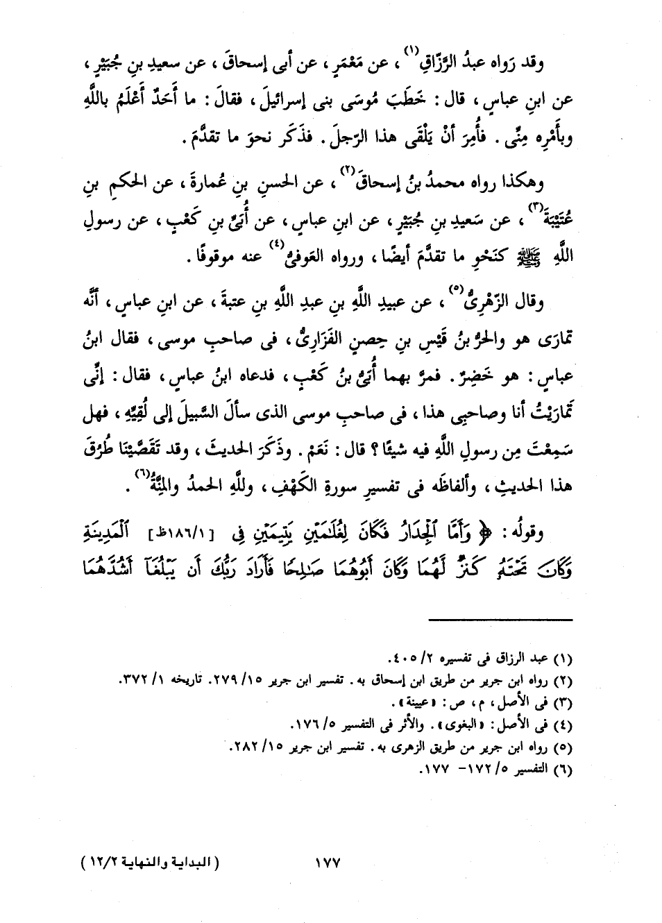 وَقَدْ رَوَاهُ عَبْدُ الرَّزَّاقِ، عَنْ مَعْمَرٍ، عَنْ أَبِي إِسْحَاقَ، عَنْ سَعِيدِ بْنِ جُبَيْرٍ، عَنِ ابْنِ عَبَّاسٍ، قَالَ: خَطَبَ مُوسَى بَنِي إِسْرَائِيلَ، فَقَالَ: مَا أَحَدٌ أَعْلَمُ بِاللَّهِ وَبِأَمْرِهِ مِنِّي. فَأُمِرَ أَنْ يَلْقَى هَذَا الرَّجُلَ. فَذَكَرَ نَحْوَ مَا تَقَدَّمَ.