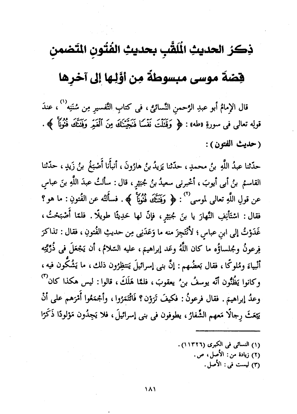 (حَدِيثُ الْفُتُونِ) : حَدَّثَنَا عَبْدُ اللَّهِ بْنُ مُحَمَّدٍ، حَدَّثَنَا يَزِيدُ بْنُ هَارُونَ، أَنْبَأَنَا أَصْبَغُ بْنُ زَيْدٍ، حَدَّثَنَا الْقَاسِمُ بْنُ أَبِي أَيُّوبَ، أَخْبَرَنِي سَعِيدُ بْنُ جُبَيْرٍ، قَالَ: سَأَلْتُ عَبْدَ اللَّهِ بْنَ عَبَّاسٍ عَنْ قَوْلِ اللَّهِ تَعَالَى لِمُوسَى: {وَفَتَنَّاكَ فُتُونًا} [طه: 40] . فَسَأَلْتُهُ عَنِ الْفُتُونِ: مَا هُوَ؟ فَقَالَ: اسْتَأْنِفِ النَّهَارَ يَا ابْنَ جُبَيْرٍ، فَإِنَّ لَهَا حَدِيثًا طَوِيلًا. فَلَمَّا أَصْبَحْتُ، غَدَوْتُ إِلَى ابْنِ عَبَّاسٍ; لِأَنْتَجِزَ مِنْهُ مَا وَعَدَنِي مِنْ حَدِيثِ الْفُتُونِ، فَقَالَ: تَذَاكَرَ فِرْعَوْنُ وَجُلَسَاؤُهُ مَا كَانَ اللَّهُ وَعَدَ إِبْرَاهِيمَ، عَلَيْهِ السَّلَامُ، أَنْ يَجْعَلَ فِي ذُرِّيَّتِهِ أَنْبِيَاءَ وَمُلُوكًا، فَقَالَ بَعْضُهُمْ: إِنَّ بَنِي إِسْرَائِيلَ يَنْتَظِرُونَ ذَلِكَ، مَا يَشُكُّونَ فِيهِ، وَكَانُوا يَظُنُّونَ أَنَّهُ يُوسُفُ بْنُ يَعْقُوبَ، فَلَمَّا هَلَكَ قَالُوا: لَيْسَ هَكَذَا كَانَ وَعْدُ إِبْرَاهِيمَ. فَقَالَ فِرْعَوْنُ: فَكَيْفَ تَرَوْنَ؟ فَائْتَمَرُوا، وَأَجْمَعُوا أَمْرَهُمْ عَلَى أَنْ يَبْعَثَ رِجَالًا مَعَهُمُ الشِّفَارُ، يَطُوفُونَ فِي بَنِي إِسْرَائِيلَ، فَلَا يَجِدُونَ مَوْلُودًا ذَكَرًا