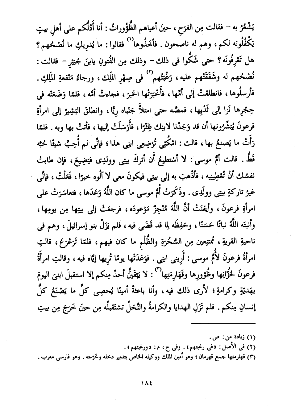 يَشْعُرُ بِهِ فَقَالَتْ مِنَ الْفَرَحِ، حِينَ أَعْيَاهُمُ الظُّؤورَاتُ: أَنَا أَدُلُّكُمْ عَلَى أَهْلِ بَيْتٍ يَكْفُلُونَهُ لَكُمْ، وَهُمْ لَهُ نَاصِحُونَ. فَأَخَذُوهَا فَقَالُوا: مَا يُدْرِيكِ مَا نُصْحُهُمْ؟ هَلْ تَعْرِفُونَهُ؟ حَتَّى شَكُّوا فِي ذَلِكَ - وَذَلِكَ مِنَ الْفُتُونِ يَا ابْنَ جُبَيْرٍ - فَقَالَتْ: نُصْحُهُمْ لَهُ وَشَفَقَتُهُمْ عَلَيْهِ، رَغْبَتُهُمْ فِي صِهْرِ الْمَلِكِ، وَرَجَاءُ مَنْفَعَةِ الْمَلِكِ. فَأَرْسَلُوهَا، فَانْطَلَقَتْ إِلَى أُمِّهَا، فَأَخْبَرَتْهَا الْخَبَرَ، فَجَاءَتْ أُمُّهُ فَلَمَّا وَضَعَتْهُ فِي حِجْرِهَا نَزَا إِلَى ثَدْيِهَا، فَمَصَّهُ حَتَّى امْتَلَأَ جَنْبَاهُ رِيًّا، وَانْطَلَقَ الْبَشِيرُ إِلَى امْرَأَةِ فِرْعَوْنَ يُبَشِّرُونَهَا أَنَّ قَدْ وَجَدْنَا لِابْنِكِ ظِئْرًا، فَأَرْسَلَتْ إِلَيْهَا، فَأَتَتْ بِهَا وَبِهِ. فَلَمَّا رَأَتْ مَا يَصْنَعُ بِهَا، قَالَتِ: امْكُثِي تُرْضِعِي ابْنِي هَذَا; فَإِنِّي لَمْ أُحِبَّ شَيْئًا حُبَّهُ قَطُّ. قَالَتْ أُمُّ مُوسَى: لَا أَسْتَطِيعُ أَنْ أَتْرُكَ بَيْتِي وَوَلَدِي فَيَضِيعَ فَإِنْ طَابَتْ نَفْسُكِ أَنْ تُعْطِينِيهِ، فَأَذْهَبَ بِهِ إِلَى بَيْتِي فَيَكُونَ مَعِي لَا آلُوهُ خَيْرًا، فَعَلْتُ، فَإِنِّي غَيْرُ تَارِكَةٍ بَيْتِي وَوَلَدِي.