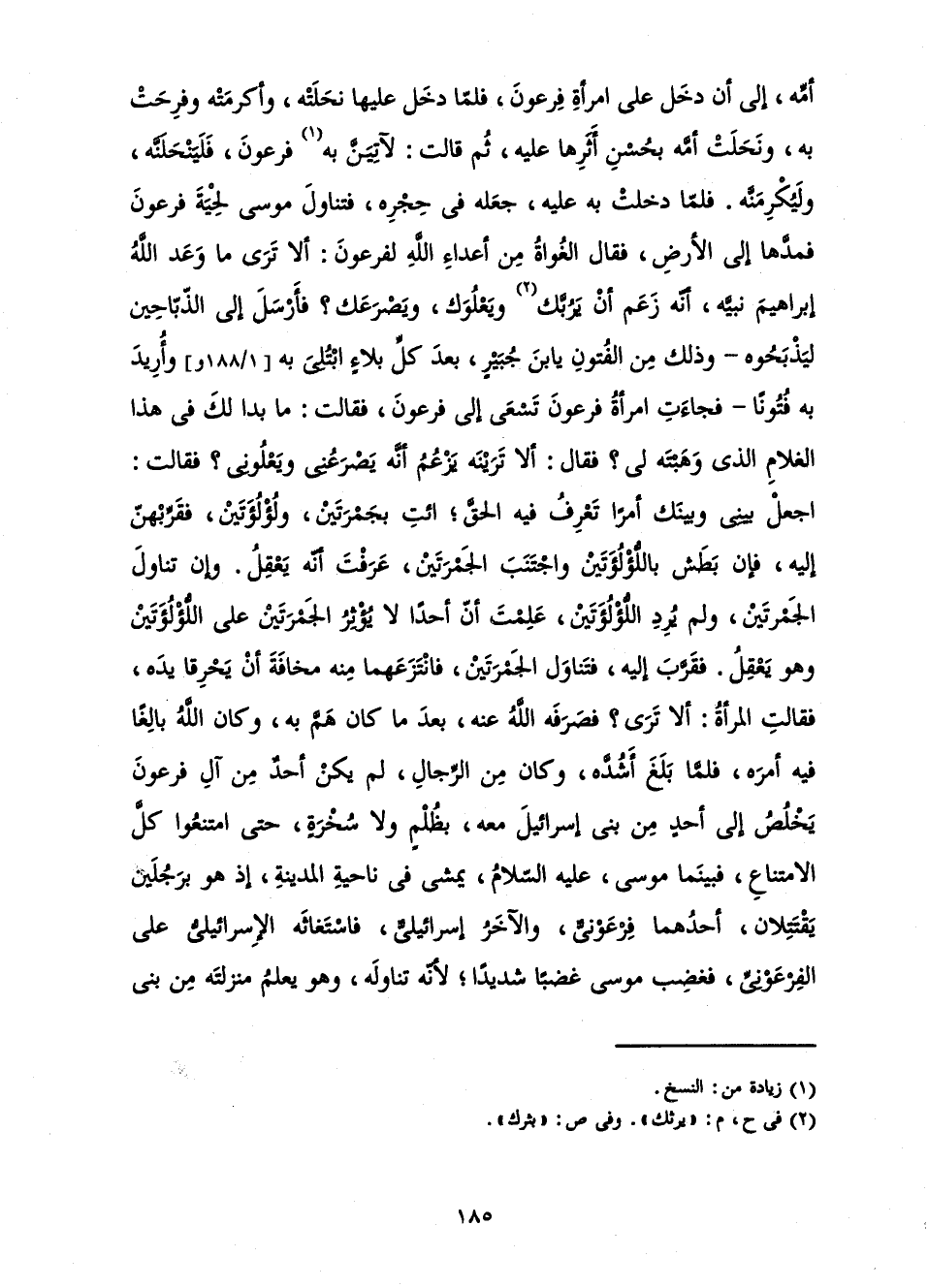أُمِّهِ إِلَى أَنَّ دَخَلَ عَلَى امْرَأَةِ فِرْعَوْنَ، فَلَمَّا دَخَلَ عَلَيْهَا نَحَلَتْهُ، وَأَكْرَمَتْهُ وَفَرِحَتْ بِهِ، وَنَحَلَتْ أُمَّهُ بِحُسْنِ أَثَرِهَا عَلَيْهِ، ثُمَّ قَالَتْ: لَآتِيَنَّ بِهِ فِرْعَوْنَ، فَلَيَنْحِلَنَّهُ، وَلَيُكْرِمَنَّهُ. فَلَمَّا دَخَلَتْ بِهِ عَلَيْهِ، جَعَلَهُ فِي حِجْرِهِ، فَتَنَاوَلَ مُوسَى لِحْيَةَ فِرْعَوْنَ فَمَدَّهَا إِلَى الْأَرْضِ، فَقَالَ الْغُوَاةُ مِنْ أَعْدَاءِ اللَّهِ لِفِرْعَوْنَ: أَلَا تَرَى مَا وَعَدَ اللَّهُ إِبْرَاهِيمَ نَبِيَّهُ، أَنَّهُ زَعَمَ أَنَّهُ يَرُبُّكَ وَيَعْلُوكَ، وَيَصْرَعُكَ؟ فَأَرْسِلْ إِلَى الذَّبَّاحِينَ لِيَذْبَحُوهُ - وَذَلِكَ مِنَ الْفُتُونِ يَا ابْنَ جُبَيْرٍ، بَعْدَ كُلِّ بَلَاءٍ ابْتُلِيَ بِهِ وَأُرِيدَ بِهِ فُتُونًا - فَجَاءَتِ امْرَأَةُ فِرْعَوْنَ تَسْعَى إِلَى فِرْعَوْنَ، فَقَالَتْ: مَا بَدَا لَكَ فِي هَذَا الْغُلَامِ الَّذِي وَهَبَتْهُ لِي؟ فَقَالَ: أَلَا تَرَيْنَهُ يَزْعُمُ أَنَّهُ يَصْرَعُنِي وَيَعْلُونِي؟ فَقَالَتِ: اجْعَلْ بَيْنِي وَبَيْنَكَ أَمْرًا تَعْرِفُ فِيهِ الْحَقَّ; ائْتِ بِجَمْرَتَيْنِ، وَلُؤْلُؤَتَيْنِ، فَقَرِّبْهُنَّ إِلَيْهِ، فَإِنْ بَطَشَ بِاللُّؤْلُؤَتَيْنِ وَاجْتَنَبَ الْجَمْرَتَيْنِ، عَرَفْتَ أَنَّهُ يَعْقِلُ. وَإِنْ تَنَاوَلَ الْجَمْرَتَيْنِ، وَلَمْ يُرِدِ اللُّؤْلُؤَتَيْنِ، عَلِمْتَ أَنَّ أَحَدًا لَا يُؤْثِرُ الْجَمْرَتَيْنِ عَلَى اللُّؤْلُؤَتَيْنِ وَهُوَ يَعْقِلُ. فَقُرِّبَ إِلَيْهِ، فَتَنَاوَلَ الْجَمْرَتَيْنِ، فَانْتَزَعَهُمَا مِنْهُ مَخَافَةَ أَنْ يَحْرِقَا يَدَهُ، فَقَالَتِ الْمَرْأَةُ: أَلَّا تَرَى؟ فَصَرَفَهُ اللَّهُ عَنْهُ، بَعْدَ مَا كَانَ هَمَّ بِهِ، وَكَانَ اللَّهُ بَالِغًا فِيهِ أَمْرَهُ، فَلَمَّا بَلَغَ أَشُدَّهُ، وَكَانَ مِنَ الرِّجَالِ، لَمْ يَكُنْ أَحَدٌ مِنْ آلِ فِرْعَوْنَ يَخْلُصُ إِلَى أَحَدٍ مِنْ بَنِي إِسْرَائِيلَ مَعَهُ، بِظُلْمٍ وَلَا سُخْرَةٍ، حَتَّى امْتَنَعُوا كُلَّ الِامْتِنَاعِ، فَبَيْنَمَا مُوسَى، عَلَيْهِ السَّلَامُ، يَمْشِي فِي نَاحِيَةِ الْمَدِينَةِ، إِذَا هُوَ بِرَجُلَيْنِ يَقْتَتِلَانِ، أَحَدُهُمَا فِرْعَوْنِيٌّ، وَالْآخَرُ إِسْرَائِيلِيٌّ، فَاسْتَغَاثَهُ الْإِسْرَائِيلِيُّ عَلَى الْفِرْعَوْنِيِّ، فَغَضِبَ مُوسَى غَضَبًا شَدِيدًا; لِأَنَّهُ تَنَاوَلَهُ، وَهُوَ يَعْلَمُ مَنْزِلَتَهُ مِنْ بَنِي