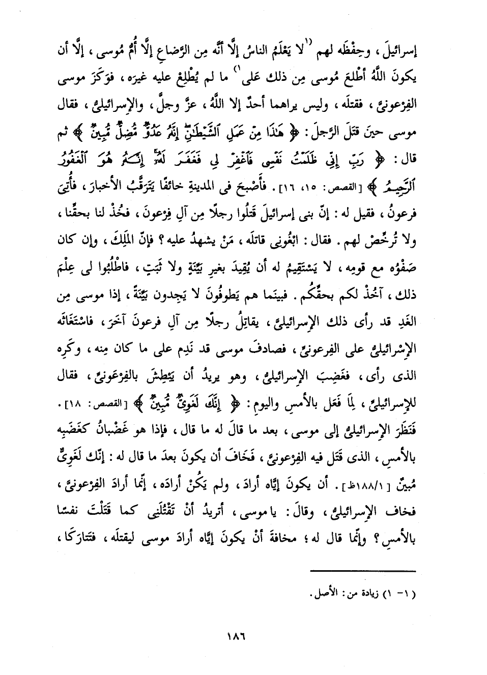 [الْقَصَصِ: 18] . فَنَظَرَ الْإِسْرَائِيلِيُّ إِلَى مُوسَى، بَعْدَ مَا قَالَ لَهُ، مَا قَالَ فَإِذَا هُوَ غَضْبَانُ كَغَضَبِهِ بِالْأَمْسِ، الَّذِي قَتَلَ فِيهِ الْفِرْعَوْنِيَّ، فَخَافَ أَنْ يَكُونَ بَعْدَ مَا قَالَ لَهُ: إِنَّكَ لَغَوِيٌّ مُبِينٌ. أَنْ يَكُونَ إِيَّاهُ أَرَادَ، وَلَمْ يَكُنْ أَرَادَهُ، إِنَّمَا أَرَادَ الْفِرْعَوْنِيَّ، فَخَافَ الْإِسْرَائِيلِيُّ، وَقَالَ: يَا مُوسَى، أَتُرِيدُ أَنْ تَقْتُلَنِي كَمَا قَتَلْتَ نَفْسًا بِالْأَمْسِ؟ وَإِنَّمَا قَالَ لَهُ; مَخَافَةَ أَنْ يَكُونَ إِيَّاهُ أَرَادَ مُوسَى لِيَقْتُلَهُ، فَتَتَارَكَا،