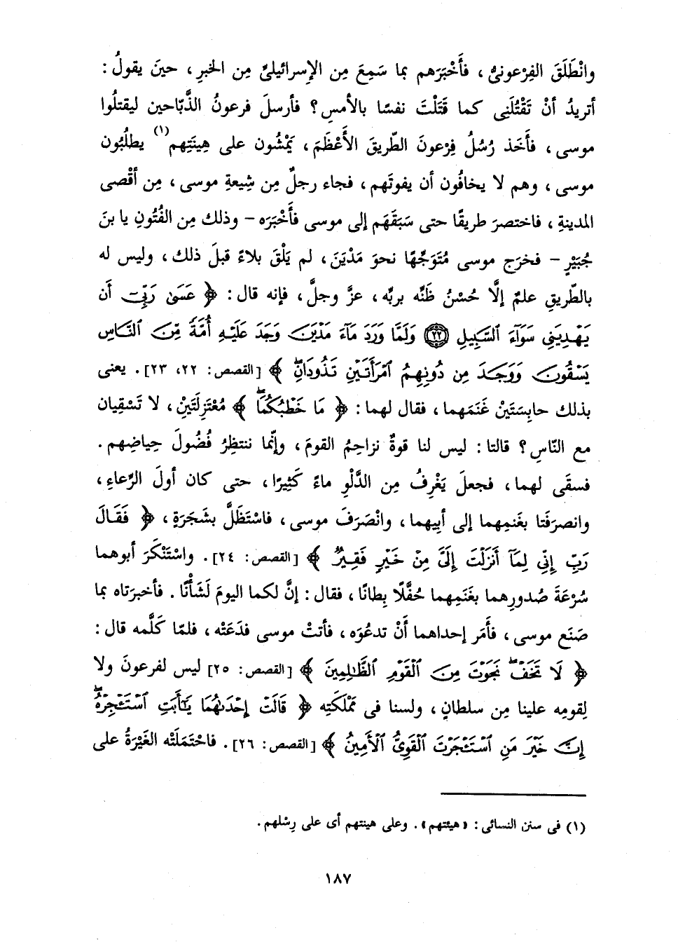 [الْقَصَصِ: 22، 23] . يَعْنِي بِذَلِكَ حَابِسَتَيْنِ غَنَمَهُمَا، فَقَالَ لَهُمَا: {مَا خَطْبُكُمَا} [القصص: 23] مُعْتَزِلَتَيْنِ، لَا تَسْقِيَانِ مَعَ النَّاسِ؟ قَالَتَا: لَيْسَ لَنَا قُوَّةٌ نُزَاحِمُ الْقَوْمَ، وَإِنَّمَا نَنْتَظِرُ فُضُولَ حِيَاضِهِمْ. فَسَقَى لَهُمَا، فَجَعَلَ يَغْرِفُ مِنَ الدَّلْوِ مَاءً كَثِيرًا، حَتَّى كَانَ أَوَّلَ الرِّعَاءِ، وَانْصَرَفَتَا بِغَنَمِهِمَا إِلَى أَبِيهِمَا، وَانْصَرَفَ مُوسَى، فَاسْتَظَلَّ بِشَجَرَةٍ، {فَقَالَ رَبِّ إِنِّي لِمَا أَنْزَلْتَ إِلَيَّ مِنْ خَيْرٍ فَقِيرٌ} [القصص: 24] . وَاسْتَنْكَرَ أَبُوهُمَا سُرْعَةَ صُدُورِهِمَا بِغَنَمِهِمَا حُفَّلًا بِطَانًا، فَقَالَ: إِنَّ لَكُمَا الْيَوْمَ لَشَأْنًا. فَأَخْبَرَتَاهُ بِمَا صَنَعَ مُوسَى، فَأَمَرَ إِحْدَاهُمَا أَنْ تَدْعُوَهُ، فَأَتَتْ مُوسَى فَدَعَتْهُ، فَلَمَّا كَلَّمَهُ قَالَ: {لَا تَخَفْ نَجَوْتَ مِنَ الْقَوْمِ الظَّالِمِينَ} [القصص: 25] . لَيْسَ لِفِرْعَوْنَ وَلَا لِقَوْمِهِ عَلَيْنَا مِنْ سُلْطَانٍ، وَلَسْنَا فِي مَمْلَكَتِهِ {قَالَتْ إِحْدَاهُمَا يَا أَبَتِ اسْتَأْجِرْهُ إِنَّ خَيْرَ مَنِ اسْتَأْجَرْتَ الْقَوِيُّ الْأَمِينُ} [القصص: 26] . فَاحْتَمَلَتْهُ الْغَيْرَةُ عَلَى