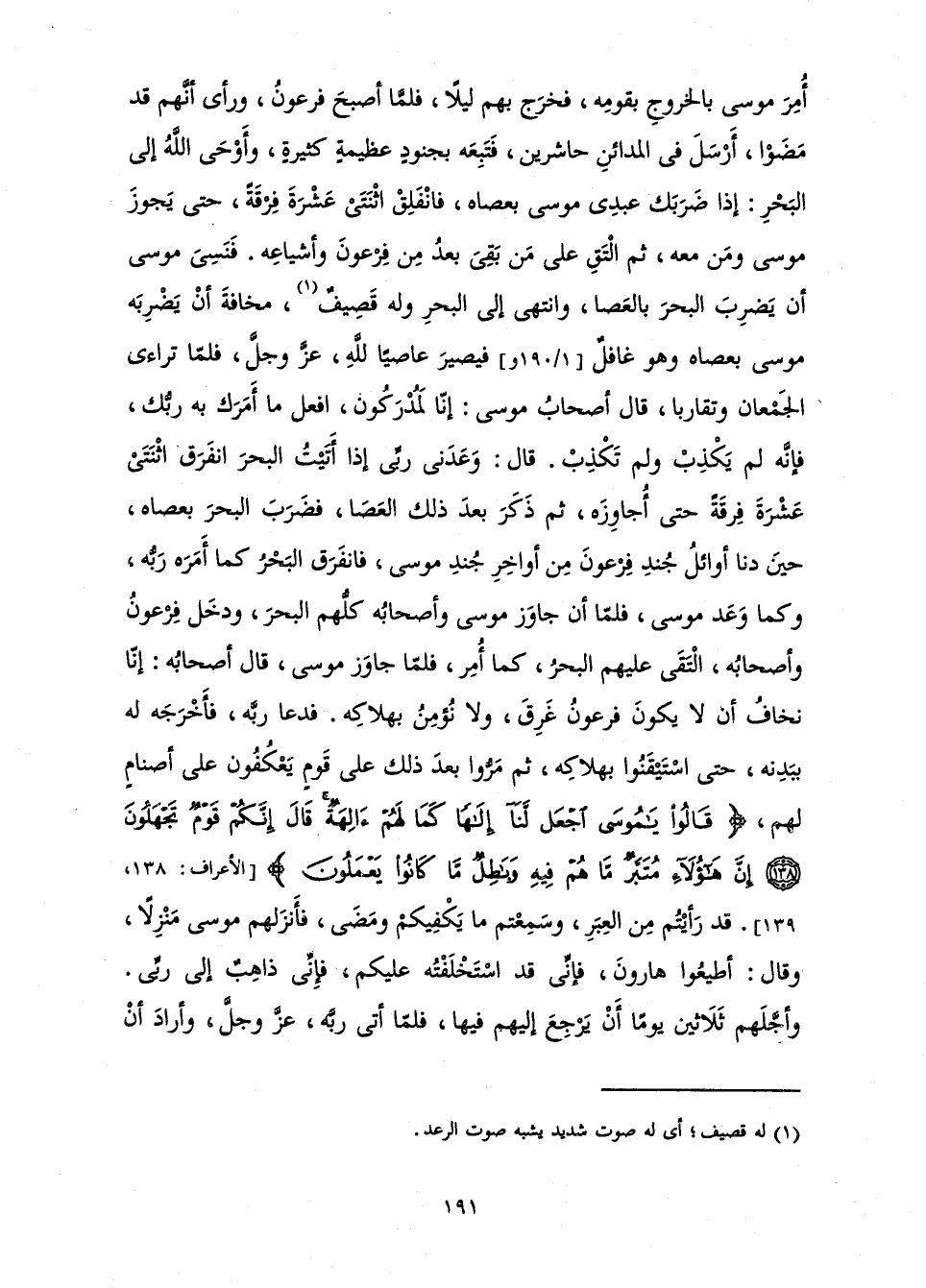 أَمَرَ مُوسَى بِالْخُرُوجِ بِقَوْمِهِ، فَخَرَجَ بِهِمْ لَيْلًا، فَلَمَّا أَصْبَحَ فِرْعَوْنُ، وَرَأَى أَنَّهُمْ قَدْ مَضَوْا، أَرْسَلَ فِي الْمَدَائِنِ حَاشِرِينَ، فَتَبِعَهُ بِجُنُودٍ عَظِيمَةٍ كَثِيرَةٍ، وَأَوْحَى اللَّهُ إِلَى الْبَحْرِ: إِذَا ضَرَبَكَ عَبْدِي مُوسَى بِعَصَاهُ، فَانْفَلِقِ اثْنَتَيْ عَشْرَةَ فِرْقَةً، حَتَّى يَجُوزَ مُوسَى وَمَنْ مَعَهُ، ثُمَّ الْتَقِ عَلَى مَنْ بَقِيَ بَعْدُ مِنْ فِرْعَوْنَ وَأَشْيَاعِهِ. فَنَسِيَ مُوسَى أَنْ يَضْرِبَ الْبَحْرَ بِالْعَصَا، وَانْتَهَى إِلَى الْبَحْرِ وَلَهُ قَصِيفٌ مَخَافَةَ أَنْ يَضْرِبَهُ مُوسَى بِعَصَاهُ وَهُوَ غَافِلٌ فَيَصِيرُ عَاصِيًا لِلَّهِ، عَزَّ وَجَلَّ، فَلَمَّا تَرَاءَى الْجَمْعَانِ وَتَقَارَبَا، قَالَ أَصْحَابُ مُوسَى: {إِنَّا لَمُدْرَكُونَ} [الشعراء: 61] افْعَلْ مَا أَمَرَكَ بِهِ رَبُّكَ، فَإِنَّهُ لَمْ يَكْذِبْ وَلَمْ تَكْذِبْ. قَالَ: وَعَدَنِي رَبِّي إِذَا أَتَيْتُ الْبَحْرَ انْفَرَقَ اثْنَتَيْ عَشْرَةَ فِرْقَةً حَتَّى أُجَاوِزَهُ، ثُمَّ ذَكَرَ بَعْدَ ذَلِكَ الْعَصَا، فَضَرَبَ الْبَحْرَ بِعَصَاهُ، حِينَ دَنَا أَوَائِلُ جُنْدِ فِرْعَوْنَ مِنْ أَوَاخِرِ جُنْدِ مُوسَى، فَانْفَرَقَ الْبَحْرُ كَمَا أَمَرَهُ رَبُّهُ، وَكَمَا وَعَدَ مُوسَى، فَلَمَّا أَنْ جَاوَزَ مُوسَى وَأَصْحَابُهُ كُلُّهُمُ الْبَحْرَ، وَدَخَلَ فِرْعَوْنُ وَأَصْحَابُهُ، الْتَقَى عَلَيْهِمُ الْبَحْرُ كَمَا أَمَرَ، فَلَمَّا جَاوَزَ مُوسَى، قَالَ أَصْحَابُهُ: إِنَّا نَخَافُ أَنْ لَا يَكُونَ فِرْعَوْنُ غَرِقَ، وَلَا نُؤْمِنُ بِهَلَاكِهِ. فَدَعَا رَبَّهُ، فَأَخْرَجَهُ لَهُ بِبَدَنِهِ، حَتَّى اسْتَيْقَنُوا بِهَلَاكِهِ، ثُمَّ مَرُّوا بَعْدَ ذَلِكَ عَلَى قَوْمٍ يَعْكُفُونَ عَلَى أَصْنَامٍ لَهُمْ، {قَالُوا يَا مُوسَى اجْعَلْ لَنَا إِلَهًا كَمَا لَهُمْ آلِهَةٌ قَالَ إِنَّكُمْ قَوْمٌ تَجْهَلُونَ - إِنَّ هَؤُلَاءِ مُتَبَّرٌ مَا هُمْ فِيهِ وَبَاطِلٌ مَا كَانُوا يَعْمَلُونَ} [الأعراف: 138 - 139]
