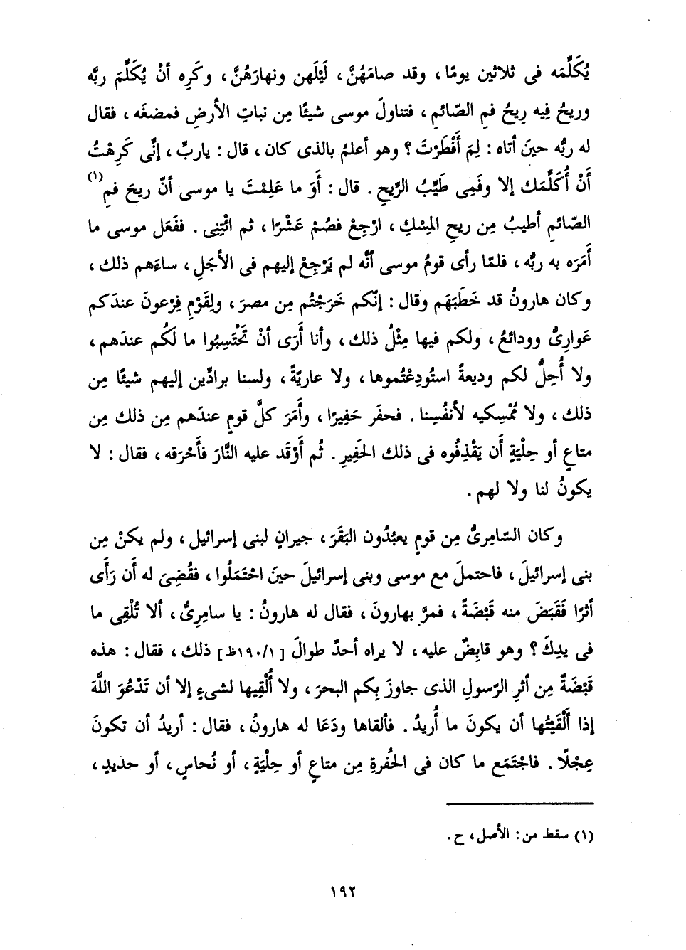 يُكَلِّمَهُ فِي ثَلَاثِينَ يَوْمًا، وَقَدْ صَامَهُنَّ، لَيْلَهُنَّ وَنَهَارَهُنَّ وَكَرِهَ أَنْ يُكَلِّمَ رَبَّهُ وَرِيحُ فِيهِ رِيحُ فَمِ الصَّائِمِ، فَتَنَاوَلَ مُوسَى شَيْئًا مِنْ نَبَاتِ الْأَرْضِ فَمَضَغَهُ، فَقَالَ لَهُ رَبُّهُ حِينَ أَتَاهُ: لِمَ أَفْطَرْتَ؟ وَهُوَ أَعْلَمُ بِالَّذِي كَانَ، قَالَ: يَا رَبِّ إِنِّي كَرِهْتُ أَنْ أُكَلِّمَكَ إِلَّا وَفَمِي طَيِّبُ الرِّيحِ. قَالَ: أَوَمَا عَلِمْتَ يَا مُوسَى أَنَّ رِيحَ فَمِ الصَّائِمِ أَطْيَبُ مِنْ رِيحِ الْمِسْكِ ارْجِعْ فَصُمْ عَشْرًا، ثُمَّ ائْتِنِي. فَفَعَلَ مُوسَى مَا أَمَرَهُ بِهِ رَبُّهُ، فَلَمَّا رَأَى قَوْمُ مُوسَى أَنَّهُ لَمْ يَرْجِعْ إِلَيْهِمْ فِي الْأَجَلِ، سَاءَهُمْ ذَلِكَ، وَكَانَ هَارُونُ قَدْ خَطَبَهُمْ وَقَالَ: إِنَّكُمْ خَرَجْتُمْ مِنْ مِصْرَ، وَلِقَوْمِ فِرْعَوْنَ عِنْدَكُمْ عَوَارِيُّ وَوَدَائِعُ، وَلَكُمْ فِيهَا مِثْلُ ذَلِكَ، وَأَنَا أَرَى أَنْ تَحْتَسِبُوا مَا لَكُمْ عِنْدَهُمْ، وَلَا أُحِلُّ لَكُمْ وَدِيعَةً اسْتَوْدَعْتُمُوهَا، وَلَا عَارِيَّةً، وَلَسْنَا بِرَادِّينَ إِلَيْهِمْ شَيْئًا مِنْ ذَلِكَ، وَلَا مُمْسَكِيهِ لِأَنْفُسِنَا. فَحَفَرَ حَفِيرًا، وَأَمَرَ كُلَّ قَوْمٍ عِنْدَهُمْ مِنْ ذَلِكَ مِنْ مَتَاعٍ أَوْ حِلْيَةٍ أَنْ يَقْذِفُوهُ فِي ذَلِكَ الْحَفِيرِ. ثُمَّ أَوْقَدَ عَلَيْهِ النَّارَ فَأَحْرَقَهُ، فَقَالَ: لَا يَكُونُ لَنَا وَلَا لَهُمْ.