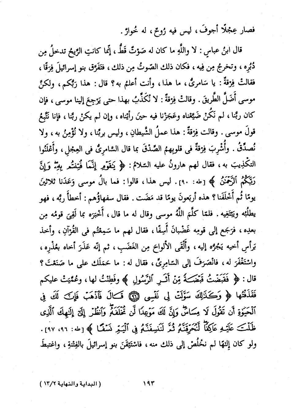 قَالَ ابْنُ عَبَّاسٍ: لَا وَاللَّهِ مَا كَانَ لَهُ صَوْتٌ قَطُّ، إِنَّمَا كَانَتِ الرِّيحُ تَدْخُلُ مِنْ دُبُرِهِ، وَتَخْرُجُ مِنْ فِيهِ، فَكَانَ ذَلِكَ الصَّوْتُ مِنْ ذَلِكَ، فَتَفَرَّقَ بَنُو إِسْرَائِيلَ فِرَقًا، فَقَالَتْ فِرْقَةٌ: يَا سَامِرِيُّ، مَا هَذَا، وَأَنْتَ أَعْلَمُ بِهِ؟ قَالَ: هَذَا رَبُّكُمْ، وَلَكِنَّ مُوسَى أَضَلَّ الطَّرِيقَ. وَقَالَتْ فِرْقَةٌ: لَا نُكَذِّبُ بِهَذَا حَتَّى يَرْجِعَ إِلَيْنَا مُوسَى، فَإِنْ كَانَ رَبُّنَا، لَمْ نَكُنْ ضَيَّعْنَاهُ وَعَجَزْنَا فِيهِ حِينَ رَأَيْنَاهُ، وَإِنْ لَمْ يَكُنْ رَبَّنَا فَإِنَّا نَتَّبِعُ قَوْلَ مُوسَى. وَقَالَتْ فِرْقَةٌ: هَذَا مِنْ عَمَلِ الشَّيْطَانِ، وَلَيْسَ بِرَبِّنَا، وَلَا نُؤْمِنُ بِهِ، وَلَا نُصَدِّقُ. وَأُشْرِبُ فِرْقَةٌ فِي قُلُوبِهِمُ الصِّدْقَ بِمَا قَالَ السَّامِرِيُّ فِي الْعِجْلِ، وَأَعْلَنُوا التَّكْذِيبَ بِهِ، فَقَالَ لَهُمْ هَارُونُ عَلَيْهِ السَّلَامُ: {يَاقَوْمِ إِنَّمَا فُتِنْتُمْ بِهِ وَإِنَّ رَبَّكُمُ الرَّحْمَنُ} [طه: 90] . لَيْسَ هَذَا، قَالُوا: فَمَا بَالُ مُوسَى وَعَدَنَا ثَلَاثِينَ يَوْمًا ثُمَّ أَخْلَفَنَا؟ هَذِهِ أَرْبَعُونَ يَوْمًا قَدْ مَضَتْ. قَالَ سُفَهَاؤُهُمْ: أَخْطَأَ رَبَّهُ، فَهُوَ يَطْلُبُهُ وَيَبْتَغِيهِ. فَلَمَّا كَلَّمَ اللَّهُ مُوسَى وَقَالَ لَهُ مَا قَالَ، أَخْبَرَهُ بِمَا لَقِيَ قَوْمُهُ مِنْ بَعْدِهِ، فَرَجَعَ إِلَى قَوْمِهِ غَضْبَانَ أَسَفًا، فَقَالَ لَهُمْ مَا سَمِعْتُمْ مَا فِي الْقُرْآنِ، وَأَخَذَ بِرَأْسِ أَخِيهِ يَجُرُّهُ إِلَيْهِ وَأَلْقَى الْأَلْوَاحَ مِنَ الْغَضَبِ، ثُمَّ إِنَّهُ عَذَرَ أَخَاهُ بِعُذْرِهِ، وَاسْتَغْفَرَ لَهُ، فَانْصَرَفَ إِلَى السَّامِرِيِّ، فَقَالَ لَهُ: مَا حَمَلَكَ عَلَى مَا صَنَعْتَ؟ قَالَ: {فَقَبَضْتُ قَبْضَةً مِنْ أَثَرِ الرَّسُولِ} [طه: 96] وَفَطِنْتُ لَهَا، وَعُمِّيَتْ عَلَيْكُمْ فَقَذَفْتُهَا {وَكَذَلِكَ سَوَّلَتْ لِي نَفْسِي - قَالَ فَاذْهَبْ فَإِنَّ لَكَ فِي الْحَيَاةِ أَنْ تَقُولَ لَا مِسَاسَ وَإِنَّ لَكَ مَوْعِدًا لَنْ تُخْلَفَهُ وَانْظُرْ إِلَى إِلَهِكَ الَّذِي ظَلْتَ عَلَيْهِ عَاكِفًا لَنُحَرِّقَنَّهُ ثُمَّ لَنَنْسِفَنَّهُ فِي الْيَمِّ نَسْفًا} [طه: 96 - 97]