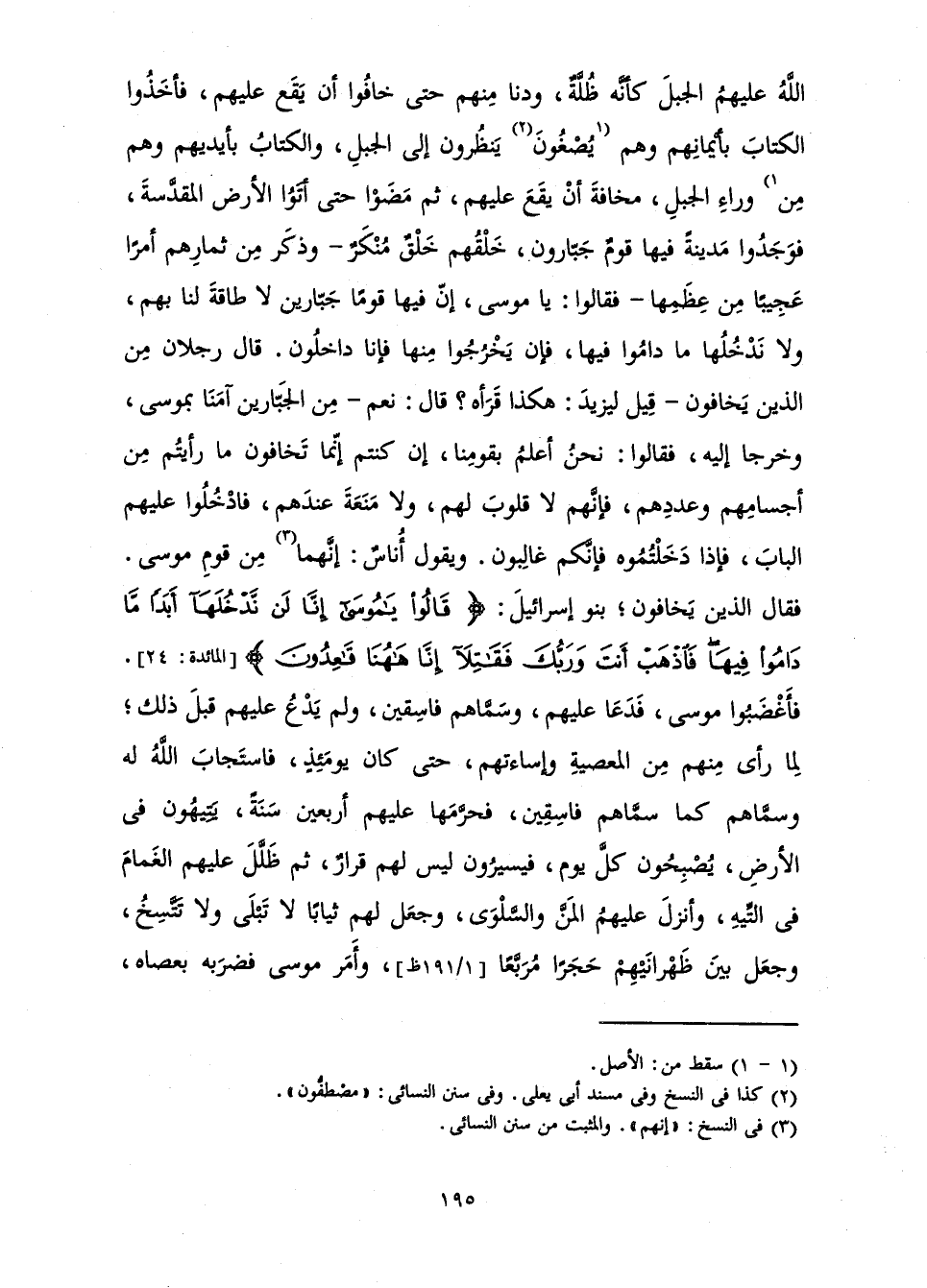 اللَّهُ عَلَيْهِمُ الْجَبَلَ كَأَنَّهُ ظُلَّةٌ، وَدَنَا مِنْهُمْ حَتَّى خَافُوا أَنْ يَقَعَ عَلَيْهِمْ، فَأَخَذُوا الْكِتَابَ بِأَيْمَانِهِمْ وَهُمْ يُصْغُونَ يَنْظُرُونَ إِلَى الْجَبَلِ، وَالْكِتَابُ بِأَيْدِيهِمْ وَهُمْ مِنْ وَرَاءِ الْجَبَلِ، مَخَافَةَ أَنْ يَقَعَ عَلَيْهِمْ، ثُمَّ مَضَوْا حَتَّى أَتَوُا الْأَرْضَ الْمُقَدَّسَةَ، فَوَجَدُوا مَدِينَةً فِيهَا قَوْمٌ جَبَّارُونَ، خَلْقُهُمْ خَلْقٌ مُنْكَرٌ - وَذَكَرَ مِنْ ثِمَارِهِمْ أَمْرًا عَجِيبًا مِنْ عِظَمِهَا - فَقَالُوا: يَا مُوسَى إِنَّ فِيهَا قَوْمًا جَبَّارِينَ لَا طَاقَةَ لَنَا بِهِمْ، وَلَا نَدْخُلُهَا مَا دَامُوا فِيهَا، فَإِنْ يَخْرُجُوا مِنْهَا فَإِنَّا دَاخِلُونَ. قَالَ رَجُلَانِ مِنَ الَّذِينَ يَخَافُونَ - قِيلَ لِيَزِيدَ: هَكَذَا قَرَأَهُ؟ قَالَ: نَعَمْ - مِنَ الْجَبَّارِينَ آمَنَّا بِمُوسَى، وَخَرَجَا إِلَيْهِ، فَقَالُوا: نَحْنُ أَعْلَمُ بِقَوْمِنَا، إِنْ كُنْتُمْ إِنَّمَا تَخَافُونَ مَا رَأَيْتُمْ مِنْ أَجْسَامِهِمْ وَعَدَدِهِمْ، فَإِنَّهُمْ لَا قُلُوبَ لَهُمْ، وَلَا مَنَعَةَ عِنْدَهُمْ، فَادْخُلُوا عَلَيْهِمُ الْبَابَ، فَإِذَا دَخَلْتُمُوهُ فَإِنَّكُمْ غَالِبُونَ. وَيَقُولُ أُنَاسٌ: إِنَّهُمَا مِنْ قَوْمِ مُوسَى. فَقَالَ الَّذِينَ يَخَافُونَ; بَنُو إِسْرَائِيلَ: {قَالُوا يَا مُوسَى إِنَّا لَنْ نَدْخُلَهَا أَبَدًا مَا دَامُوا فِيهَا فَاذْهَبْ أَنْتَ وَرَبُّكَ فَقَاتِلَا إِنَّا هَاهُنَا قَاعِدُونَ} [المائدة: 24] . فَأَغْضَبُوا مُوسَى، فَدَعَا عَلَيْهِمْ، وَسَمَّاهُمْ فَاسِقِينَ، وَلَمْ يَدْعُ عَلَيْهِمْ قَبْلَ ذَلِكَ; لِمَا رَأَى مِنْهُمْ مِنَ الْمَعْصِيَةِ وَإِسَاءَتِهِمْ، حَتَّى كَانَ يَوْمَئِذٍ، فَاسْتَجَابَ اللَّهُ لَهُ وَسَمَّاهُمْ كَمَا سَمَّاهُمْ فَاسِقِينَ، فَحَرَّمَهَا عَلَيْهِمْ أَرْبَعِينَ سَنَةً، يَتِيهُونَ فِي الْأَرْضِ، يُصْبِحُونَ كُلَّ يَوْمٍ، فَيَسِيرُونَ لَيْسَ لَهُمْ قَرَارٌ، ثُمَّ ظَلَّلَ عَلَيْهِمُ الْغَمَامَ فِي التِّيهِ، وَأَنْزَلَ عَلَيْهِمُ الْمَنَّ وَالسَّلْوَى، وَجَعَلَ لَهُمْ ثِيَابًا لَا تَبْلَى وَلَا تَتَّسِخُ، وَجَعَلَ بَيْنَ ظَهْرَانَيْهِمْ حَجَرًا مُرَبَّعًا وَأَمَرَ مُوسَى فَضَرَبَهُ بِعَصَاهُ،