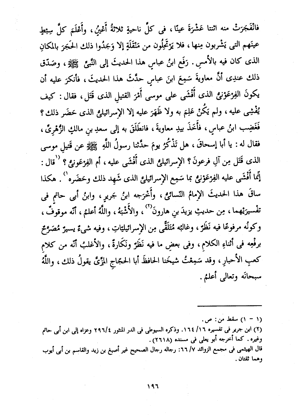 فَانْفَجَرَتْ مِنْهُ اثْنَتَا عَشْرَةَ عَيْنًا، فِي كُلِّ نَاحِيَةٍ ثَلَاثَةُ أَعْيُنٍ، وَأَعْلَمَ كُلَّ سِبْطٍ عَيْنَهُمُ الَّتِي يَشْرَبُونَ مِنْهَا، فَلَا يَرْتَحِلُونَ مِنْ مَنْقَلَةٍ إِلَّا وَجَدُوا ذَلِكَ الْحَجَرَ بِالْمَكَانِ الَّذِي كَانَ فِيهِ بِالْأَمْسِ. رَفَعَ ابْنُ عَبَّاسٍ هَذَا الْحَدِيثَ إِلَى النَّبِيِّ صَلَّى اللَّهُ عَلَيْهِ وَسَلَّمَ وَصَدَّقَ ذَلِكَ عِنْدِي أَنَّ مُعَاوِيَةَ سَمِعَ ابْنَ عَبَّاسٍ حَدَّثَ هَذَا الْحَدِيثَ فَأَنْكَرَ عَلَيْهِ أَنْ يَكُونَ الْفِرْعَوْنِيُّ الَّذِي أَفْشَى عَلَى مُوسَى أَمْرَ الْقَتِيلِ الَّذِي قَتَلَ، فَقَالَ: كَيْفَ يُفْشِي عَلَيْهِ، وَلَمْ يَكُنْ عَلِمَ بِهِ وَلَا ظَهَرَ عَلَيْهِ إِلَّا الْإِسْرَائِيلِيُّ الَّذِي حَضَرَ ذَلِكَ؟ فَغَضِبَ ابْنُ عَبَّاسٍ، فَأَخَذَ بِيَدِ مُعَاوِيَةَ، فَانْطَلَقَ بِهِ إِلَى سَعْدِ بْنِ مَالِكٍ الزُّهْرِيِّ، فَقَالَ لَهُ: يَا أَبَا إِسْحَاقَ، هَلْ تَذْكُرُ يَوْمَ حَدَّثَنَا رَسُولُ اللَّهِ صَلَّى اللَّهُ عَلَيْهِ وَسَلَّمَ عَنْ قَتِيلِ مُوسَى الَّذِي قَتَلَ مِنْ آلِ فِرْعَوْنَ؟ الْإِسْرَائِيلِيُّ الَّذِي أَفْشَى عَلَيْهِ، أَمِ الْفِرْعَوْنِيُّ؟ قَالَ: إِنَّمَا أَفْشَى عَلَيْهِ الْفِرْعَوْنِيُّ بِمَا سَمِعَ الْإِسْرَائِيلِيَّ الَّذِي شَهِدَ ذَلِكَ وَحَضَرَهُ. هَكَذَا سَاقَ هَذَا الْحَدِيثَ الْإِمَامُ النَّسَائِيُّ، وَأَخْرَجَهُ ابْنُ جَرِيرٍ، وَابْنُ أَبِي حَاتِمٍ، فِي تَفْسِيرِهِمَا مِنْ حَدِيثِ يَزِيدَ بْنِ هَارُونَ، وَالْأَشْبَهُ، وَاللَّهُ أَعْلَمُ، أَنَّهُ مَوْقُوفٌ، وَكَوْنُهُ مَرْفُوعًا فِيهِ نَظَرٌ، وَغَالِبُهُ مُتَلَقًّى مِنَ الْإِسْرَائِيلِيَّاتِ، وَفِيهِ شَيْءٌ يَسِيرٌ مُصَرَّحٌ بِرَفْعِهِ فِي أَثْنَاءِ الْكَلَامِ، وَفِي بَعْضِ مَا فِيهِ نَظَرٌ وَنَكَارَةٌ، وَالْأَغْلَبُ أَنَّهُ مِنْ كَلَامِ كَعْبِ الْأَحْبَارِ، وَقَدْ سَمِعْتُ شَيْخَنَا الْحَافِظَ أَبَا الْحَجَّاجِ الْمِزِّيَّ يَقُولُ ذَلِكَ، وَاللَّهُ سُبْحَانَهُ وَتَعَالَى أَعْلَمُ.