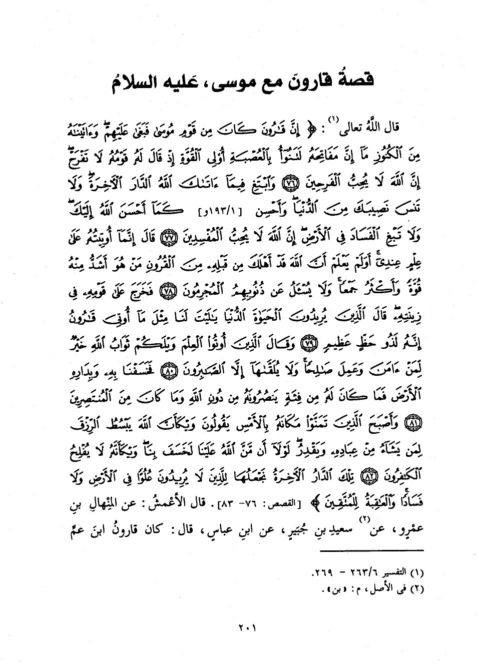 [الْقَصَصِ: 76 - 83] . قَالَ الْأَعْمَشُ: عَنِ الْمِنْهَالِ بْنِ عَمْرٍو، عَنْ سَعِيدِ بْنِ جُبَيْرٍ، عَنِ ابْنِ عَبَّاسٍ، قَالَ: كَانَ قَارُونُ ابْنَ عَمِّ