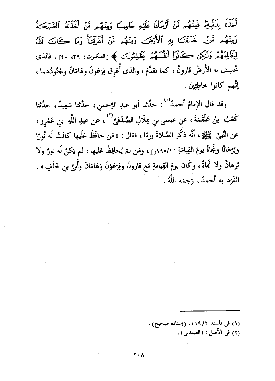وَقَدْ قَالَ الْإِمَامُ أَحْمَدُ: حَدَّثَنَا أَبُو عَبْدِ الرَّحْمَنِ، حَدَّثَنَا سَعِيدٌ، حَدَّثَنَا كَعْبُ بْنُ عَلْقَمَةَ، عَنْ عِيسَى بْنِ هِلَالٍ الصَّدَفِيِّ، عَنْ عَبْدِ اللَّهِ بْنِ عَمْرٍو، عَنِ النَّبِيِّ صَلَّى اللَّهُ عَلَيْهِ وَسَلَّمَ، أَنَّهُ ذَكَرَ الصَّلَاةَ يَوْمًا، فَقَالَ: «مَنْ حَافَظَ عَلَيْهَا كَانَتْ لَهُ نُورًا وَبُرْهَانًا وَنَجَاةً يَوْمَ الْقِيَامَةِ وَمَنْ لَمْ يُحَافِظْ عَلَيْهَا، لَمْ يَكُنْ لَهُ نُورٌ وَلَا بُرْهَانٌ وَلَا نَجَاةٌ وَكَانَ يَوْمَ الْقِيَامَةِ مَعَ قَارُونَ وَفِرْعَوْنَ وَهَامَانَ وَأُبَيِّ بْنِ خَلَفٍ» انْفَرَدَ بِهِ أَحْمَدُ، رَحِمَهُ اللَّهُ.