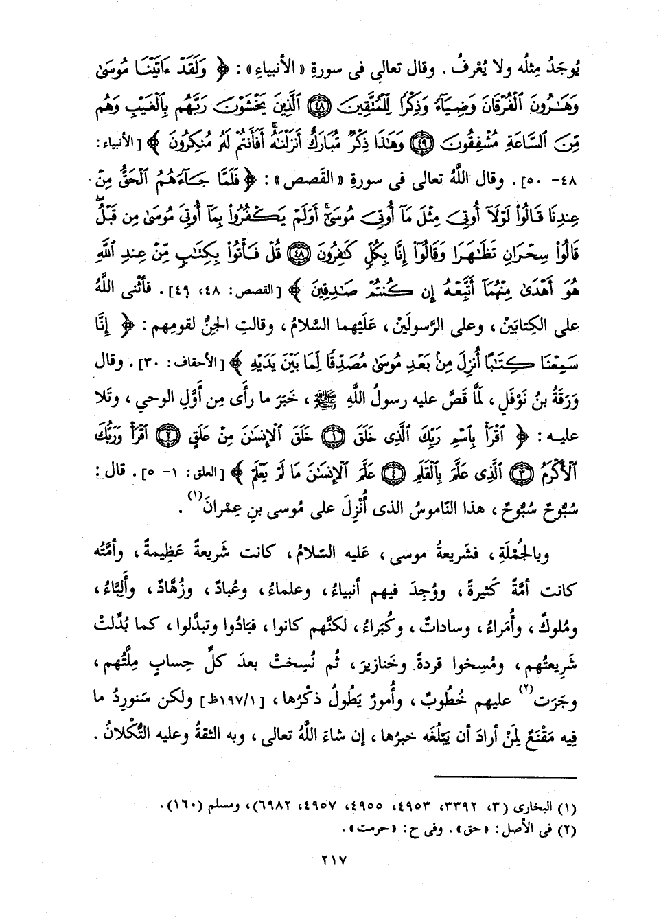 [الْأَنْبِيَاءِ: 48 - 50] . وَقَالَ اللَّهُ تَعَالَى فِي سُورَةِ " الْقَصَصِ ": {فَلَمَّا جَاءَهُمُ الْحَقُّ مِنْ عِنْدِنَا قَالُوا لَوْلَا أُوتِيَ مِثْلَ مَا أُوتِيَ مُوسَى أَوَلَمْ يَكْفُرُوا بِمَا أُوتِيَ مُوسَى مِنْ قَبْلُ قَالُوا سِحْرَانِ تَظَاهَرَا وَقَالُوا إِنَّا بِكُلٍّ كَافِرُونَ - قُلْ فَأْتُوا بِكِتَابٍ مِنْ عِنْدِ اللَّهِ هُوَ أَهْدَى مِنْهُمَا أَتَّبِعْهُ إِنْ كُنْتُمْ صَادِقِينَ} [القصص: 48 - 49]