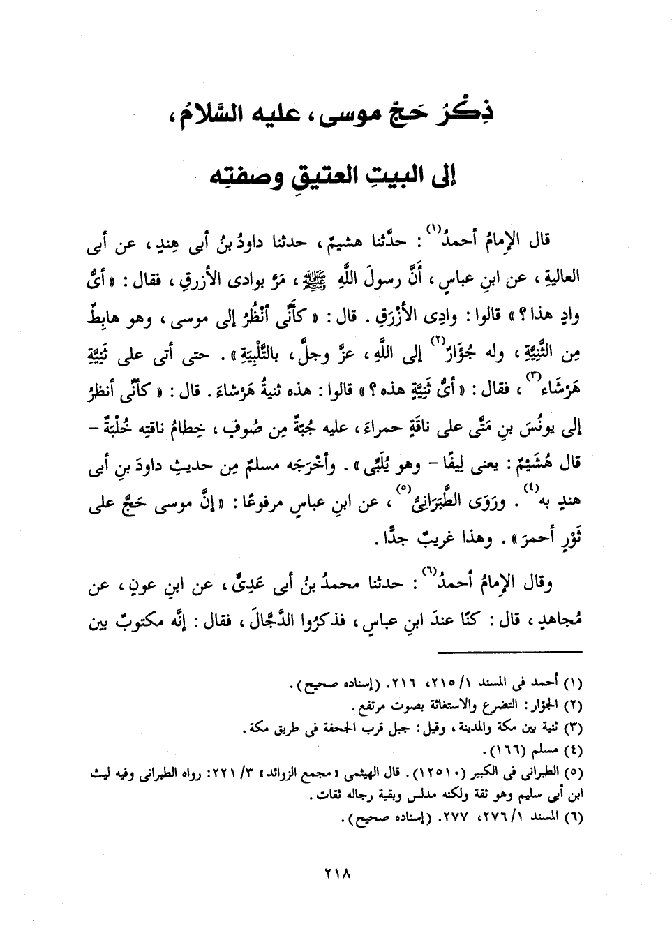 قَالَ الْإِمَامُ أَحْمَدُ: حَدَّثَنَا هُشَيْمٌ، حَدَّثَنَا دَاوُدُ بْنُ أَبِي هِنْدٍ، عَنْ أَبِي الْعَالِيَةِ، عَنِ ابْنِ عَبَّاسٍ، «أَنَّ رَسُولَ اللَّهِ صَلَّى اللَّهُ عَلَيْهِ وَسَلَّمَ، مَرَّ بِوَادِي الْأَزْرَقِ، فَقَالَ: أَيُّ وَادٍ هَذَا؟ قَالُوا: وَادِي الْأَزْرَقِ. قَالَ: كَأَنِّي أَنْظُرُ إِلَى مُوسَى، وَهُوَ هَابِطٌ مِنَ الثَّنِيَّةِ، وَلَهُ جُؤَارٌ إِلَى اللَّهِ، عَزَّ وَجَلَّ، بِالتَّلْبِيَةِ حَتَّى أَتَى عَلَى ثَنِيَّةِ هَرْشَاءَ فَقَالَ: أَيُّ ثَنِيَّةٍ هَذِهِ؟ قَالُوا: هَذِهِ ثَنِيَّةُ هَرْشَاءَ. قَالَ: كَأَنِّي أَنْظُرُ إِلَى يُونُسَ بْنِ مَتَّى، عَلَى نَاقَةٍ حَمْرَاءَ، عَلَيْهِ جُبَّةٌ مِنْ صُوفٍ، خِطَامُ نَاقَتُهُ خُلْبَةٌ، - قَالَ هُشَيْمٌ: يَعْنِي لِيفًا - وَهُوَ يُلَبِّي» وَأَخْرَجَهُ مُسْلِمٌ مِنْ حَدِيثِ دَاوُدَ بْنِ أَبِي هِنْدٍ بِهِ. وَرَوَى الطَّبَرَانِيُّ عَنِ ابْنِ عَبَّاسٍ مَرْفُوعًا: «إِنَّ مُوسَى حَجَّ عَلَى ثَوْرٍ أَحْمَرَ» وَهَذَا غَرِيبٌ جِدًّا.