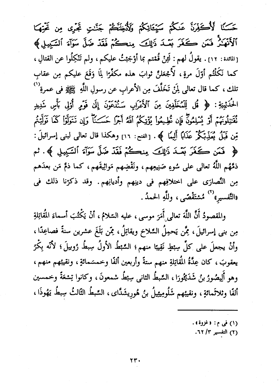 يَقُولُ لَهُمْ: لَئِنْ قُمْتُمْ بِمَا أَوْجَبْتُ عَلَيْكُمْ، وَلَمْ تَنْكِلُوا عَنِ الْقِتَالِ، كَمَا نَكَلْتُمْ أَوَّلَ مَرَّةٍ، لَأَجْعَلَنَّ ثَوَابَ هَذِهِ مُكَفِّرَةً لِمَا وَقَعَ عَلَيْكُمْ مِنْ عِقَابِ تِلْكَ، كَمَا قَالَ تَعَالَى لِمَنْ تَخَلَّفَ مِنَ الْأَعْرَابِ عَنْ رَسُولِ اللَّهِ صَلَّى اللَّهُ عَلَيْهِ وَسَلَّمَ فِي عُمْرَةِ الْحُدَيْبِيَةِ {قُلْ لِلْمُخَلَّفِينَ مِنَ الْأَعْرَابِ سَتُدْعَوْنَ إِلَى قَوْمٍ أُولِي بَأْسٍ شَدِيدٍ تُقَاتِلُونَهُمْ أَوْ يُسْلِمُونَ فَإِنْ تُطِيعُوا يُؤْتِكُمُ اللَّهُ أَجْرًا حَسَنًا وَإِنْ تَتَوَلَّوْا كَمَا تَوَلَّيْتُمْ مِنْ قَبْلُ يُعَذِّبْكُمْ عَذَابًا أَلِيمًا} [الفتح: 16] . وَهَكَذَا قَالَ تَعَالَى لِبَنِي إِسْرَائِيلَ: {فَمَنْ كَفَرَ بَعْدَ ذَلِكَ مِنْكُمْ فَقَدْ ضَلَّ سَوَاءَ السَّبِيلِ} [المائدة: 12] ثُمَّ ذَمَّهُمُ اللَّهُ تَعَالَى عَلَى سُوءِ صَنِيعِهِمْ، وَنَقْضِهِمْ مَوَاثِيقَهُمْ، كَمَا ذَمَّ مَنْ بَعْدَهُمْ مِنَ النَّصَارَى عَلَى اخْتِلَافِهِمْ فِي دِينِهِمْ وَأَدْيَانِهِمْ. وَقَدْ ذَكَرْنَا ذَلِكَ فِي " التَّفْسِيرِ " مُسْتَقْصًى، وَلِلَّهِ الْحَمْدُ.