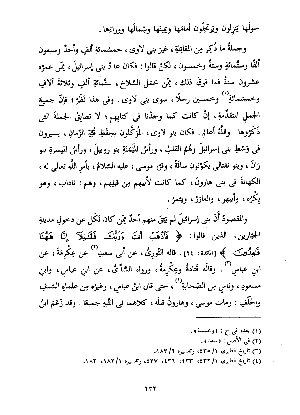 وَجُمْلَةُ مَا ذُكِرَ مِنَ الْمُقَاتِلَةِ، غَيْرَ بَنِي لَاوِي، خَمْسُمِائَةِ أَلْفٍ وَأَحَدٌ وَسَبْعُونَ أَلْفًا وَسِتُّمِائَةٍ وَسِتَّةٌ وَخَمْسُونَ، لَكِنْ قَالُوا: فَكَانَ عَدَدُ بَنِي إِسْرَائِيلَ مِمَّنْ عُمْرُهُ عِشْرُونَ سَنَةً فَمَا فَوْقَ ذَلِكَ مِمَّنْ حَمَلَ السِّلَاحَ، سِتَّمِائَةِ أَلْفٍ وَثَلَاثَةَ آلَافٍ وَخَمْسَمِائَةٍ وَخَمْسِينَ رَجُلًا، سِوَى بَنِي لَاوِي وَفِي هَذَا نَظَرٌ; فَإِنَّ جَمِيعَ الْجُمَلِ الْمُتَقَدِّمَةِ، إِنْ كَانَتْ كَمَا وَجَدْنَا فِي كِتَابِهِمْ لَا تُطَابِقُ الْجُمْلَةَ الَّتِي ذَكَرُوهَا. وَاللَّهُ أَعْلَمُ. فَكَانَ بَنُو لَاوِي الْمُوَكَّلُونَ بِحِفْظِ قُبَّةِ الزَّمَانِ، يَسِيرُونَ فِي وَسَطِ بَنِي إِسْرَائِيلَ، وَهُمُ الْقَلْبُ، وَرَأْسُ الْمَيْمَنَةِ بَنُو رُوبِيلَ، وَرَأْسُ الْمَيْسَرَةِ بَنُو رَانَ، وَبَنُو نِفْتَالِي يَكُونُونَ سَاقَةً، وَقَرَّرَ مُوسَى، عَلَيْهِ السَّلَامُ، بِأَمْرِ اللَّهِ تَعَالَى لَهُ، الْكِهَانَةَ فِي بَنِي هَارُونَ، كَمَا كَانَتْ لِأَبِيهِمْ مِنْ قَبْلِهِمْ، وَهُمْ: نَادَابُ، وَهُوَ بِكْرُهُ، وَأَبِيهُو، وَالْعَازَرُ، وَيَثْمَرُ.