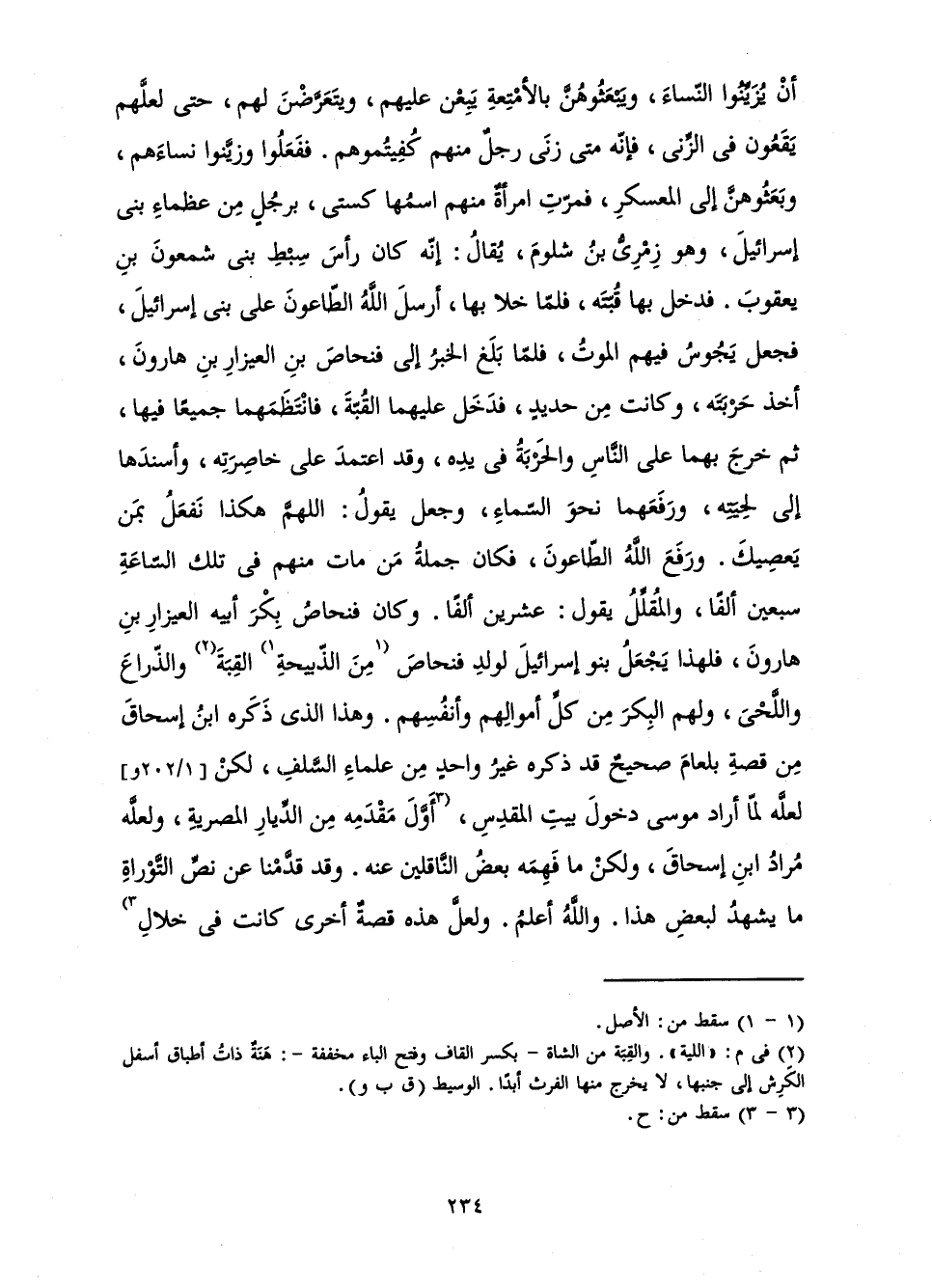 أَنْ يُزَيِّنُوا النِّسَاءَ، وَيَبْعَثُوهُنَّ بِالْأَمْتِعَةِ يَبِعْنَ عَلَيْهِمْ، وَيَتَعَرَّضْنَ لَهُمْ، حَتَّى لَعَلَّهُمْ يَقَعُونَ فِي الزِّنَى فَإِنَّهُ مَتَى زَنَى رَجُلٌ مِنْهُمْ كُفِيتُمُوهُمْ. فَفَعَلُوا وَزَيَّنُوا نِسَاءَهُمْ وَبَعَثُوهُنَّ إِلَى الْمُعَسْكَرِ، فَمَرَّتِ امْرَأَةٌ مِنْهُمُ اسْمُهَا كَسْتَى بِرَجُلٍ مِنْ عُظَمَاءِ بَنِي إِسْرَائِيلَ، وَهُوَ زِمْرِيُّ بْنُ شَلُومَ، يُقَالُ إِنَّهُ كَانَ رَأْسَ سِبْطِ بَنِي شَمْعُونَ بْنِ يَعْقُوبَ. فَدَخَلَ بِهَا قُبَّتَهُ، فَلَمَّا خَلَا بِهَا أَرْسَلَ اللَّهُ الطَّاعُونَ عَلَى بَنِي إِسْرَائِيلَ، فَجَعَلَ يَجُوسُ فِيهِمْ، فَلَمَّا بَلَغَ الْخَبَرُ إِلَى فِنْحَاصَ بْنِ الْعَيْزَارِ بْنِ هَارُونَ، أَخَذَ حَرْبَتَهُ، وَكَانَتْ مِنْ حَدِيدٍ فَدَخَلَ عَلَيْهِمَا الْقُبَّةَ، فَانْتَظَمَهُمَا جَمِيعًا فِيهَا، ثُمَّ خَرَجَ بِهِمَا عَلَى النَّاسِ وَالْحَرْبَةِ فِي يَدِهِ، وَقَدِ اعْتَمَدَ عَلَى خَاصِرَتِهِ وَأَسْنَدَهَا إِلَى لِحْيَتِهِ، وَرَفْعَهُمَا نَحْوَ السَّمَاءِ وَجَعَلَ يَقُولُ: اللَّهُمَّ هَكَذَا نَفْعَلُ بِمَنْ يَعْصِيكَ. وَرَفَعَ الطَّاعُونَ، فَكَانَ جُمْلَةُ مَنْ مَاتَ فِي تِلْكَ السَّاعَةِ سَبْعِينَ أَلْفًا، وَالْمُقَلِّلُ يَقُولُ: عِشْرِينَ أَلْفًا. وَكَانَ فِنْحَاصُ بِكْرَ أَبِيهِ الْعَيْزَارِ بْنِ هَارُونَ، فَلِهَذَا يَجْعَلُ بَنُو إِسْرَائِيلَ لِوَلَدِ فِنْحَاصَ مِنَ الذَّبِيحَةِ الْقِبَةَ وَالذِّرَاعَ وَاللَّحْيَ، وَلَهُمُ الْبِكْرُ مِنْ كُلِّ أَمْوَالِهِمْ وَأَنْفُسِهِمْ. وَهَذَا الَّذِي ذَكَرَهُ ابْنُ إِسْحَاقَ مِنْ قِصَّةِ بِلْعَامَ صَحِيحٌ قَدْ ذَكَرَهُ غَيْرُ وَاحِدٍ مِنْ عُلَمَاءِ السَّلَفِ، لَكِنْ لَعَلَّهُ لَمَّا أَرَادَ مُوسَى دُخُولَ بَيْتِ الْمَقْدِسِ، أَوَّلَ مَقْدَمِهِ مِنَ الدِّيَارِ الْمِصْرِيَّةِ، وَلَعَلَّهُ مُرَادُ ابْنِ إِسْحَاقَ، وَلَكِنَّهُ مَا فَهِمَهُ بَعْضُ النَّاقِلِينَ عَنْهُ. وَقَدْ قَدَّمْنَا عَنْ نَصِّ التَّوْرَاةِ مَا يَشْهَدُ لِبَعْضِ هَذَا. وَاللَّهُ أَعْلَمُ. وَلَعَلَّ هَذِهِ قِصَّةٌ أُخْرَى كَانَتْ فِي خِلَالِ