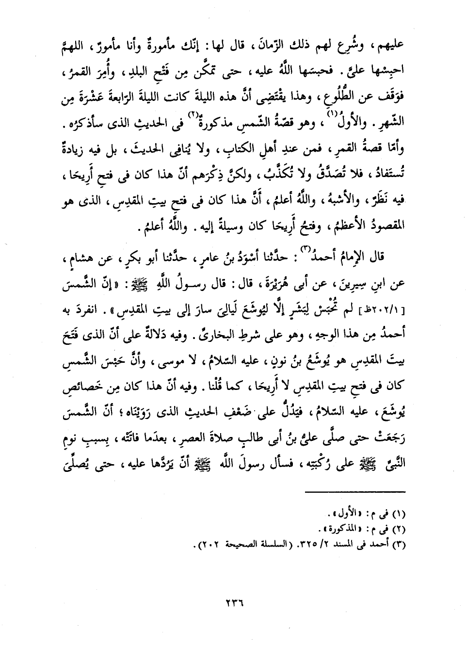 قَالَ الْإِمَامُ أَحْمَدُ: حَدَّثَنَا أَسْوَدُ بْنُ عَامِرٍ، حَدَّثَنَا أَبُو بَكْرٍ، عَنْ هِشَامٍ، عَنِ ابْنِ سِيرِينَ، عَنْ أَبِي هُرَيْرَةَ، قَالَ: قَالَ رَسُولُ اللَّهِ صَلَّى اللَّهُ عَلَيْهِ وَسَلَّمَ: «إِنَّ الشَّمْسَ لَمْ تُحْبَسْ لِبَشَرٍ إِلَّا لِيُوشَعَ لَيَالِيَ سَارَ إِلَى بَيْتِ الْمَقْدِسِ» . انْفَرَدَ بِهِ أَحْمَدُ مِنْ هَذَا الْوَجْهِ، وَهُوَ عَلَى شَرْطِ الْبُخَارِيِّ. وَفِيهِ دَلَالَةٌ عَلَى أَنَّ الَّذِي فَتَحَ بَيْتَ الْمَقْدِسِ هُوَ يُوشَعُ بْنُ نُونٍ، عَلَيْهِ السَّلَامُ، لَا مُوسَى، وَأَنَّ حَبْسَ الشَّمْسِ كَانَ فِي فَتْحِ بَيْتِ الْمَقْدِسِ لَا أَرِيحَا، كَمَا قُلْنَا وَفِيهِ أَنَّ هَذَا كَانَ مِنْ خَصَائِصِ يُوشَعَ، عَلَيْهِ السَّلَامُ، فَيَدُلُّ عَلَى ضَعْفِ الْحَدِيثِ الَّذِي رَوَيْنَاهُ; أَنَّ الشَّمْسَ رَجَعَتْ حَتَّى صَلَّى عَلِيُّ بْنُ أَبِي طَالِبٍ صَلَاةَ الْعَصْرِ، بَعْدَ مَا فَاتَتْهُ، بِسَبَبِ نَوْمِ النَّبِيِّ صَلَّى اللَّهُ عَلَيْهِ وَسَلَّمَ عَلَى رُكْبَتِهِ، فَسَأَلَ رَسُولَ اللَّهِ أَنْ يَرُدَّهَا عَلَيْهِ، حَتَّى يُصَلِّيَ
