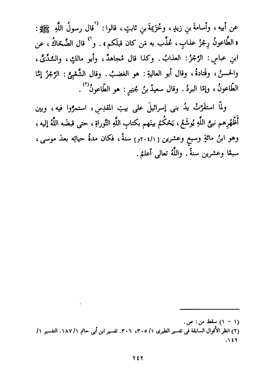 عَنْ أَبِيهِ، وَأُسَامَةَ بْنِ زَيْدٍ، وَخُزَيْمَةَ بْنِ ثَابِتٍ، قَالُوا: قَالَ رَسُولُ اللَّهِ صَلَّى اللَّهُ عَلَيْهِ وَسَلَّمَ: «الطَّاعُونُ رِجْزُ عَذَابٍ، عُذِّبَ بِهِ مَنْ كَانَ قَبْلَكُمْ» وَقَالَ الضَّحَّاكُ، عَنِ ابْنِ عَبَّاسٍ: الرِّجْزُ: الْعَذَابُ. وَكَذَا قَالَ مُجَاهِدٌ، وَأَبُو مَالِكٍ، وَالسُّدِّيُّ، وَالْحَسَنُ، وَقَتَادَةُ، وَقَالَ أَبُو الْعَالِيَةِ: هُوَ الْغَضَبُ. وَقَالَ الشَّعْبِيُّ: الرِّجْزُ إِمَّا الطَّاعُونُ، وَإِمَّا الْبَرْدُ. وَقَالَ سَعِيدُ بْنُ جُبَيْرٍ هُوَ الطَّاعُونُ.