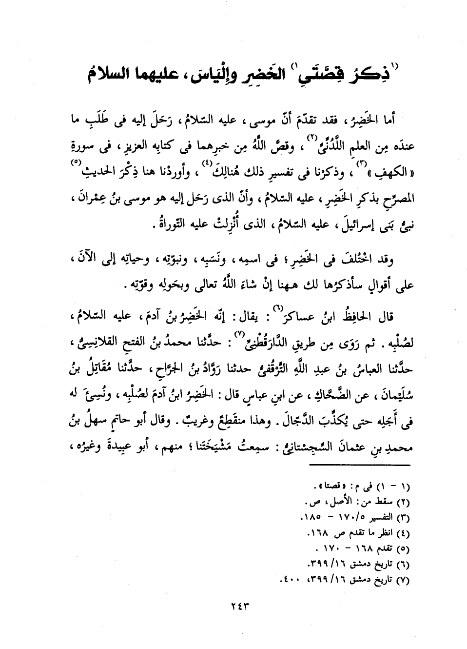 وَقَدِ اخْتُلِفَ فِي الْخَضِرِ; فِي اسْمِهِ، وَنَسَبِهِ، وَنُبُوَّتِهِ، وَحَيَاتِهِ إِلَى الْآنَ، عَلَى أَقْوَالٍ سَأَذْكُرُهَا لَكَ هَاهُنَا إِنْ شَاءَ اللَّهُ وَبِحَوْلِهِ وَقُوَّتِهِ.