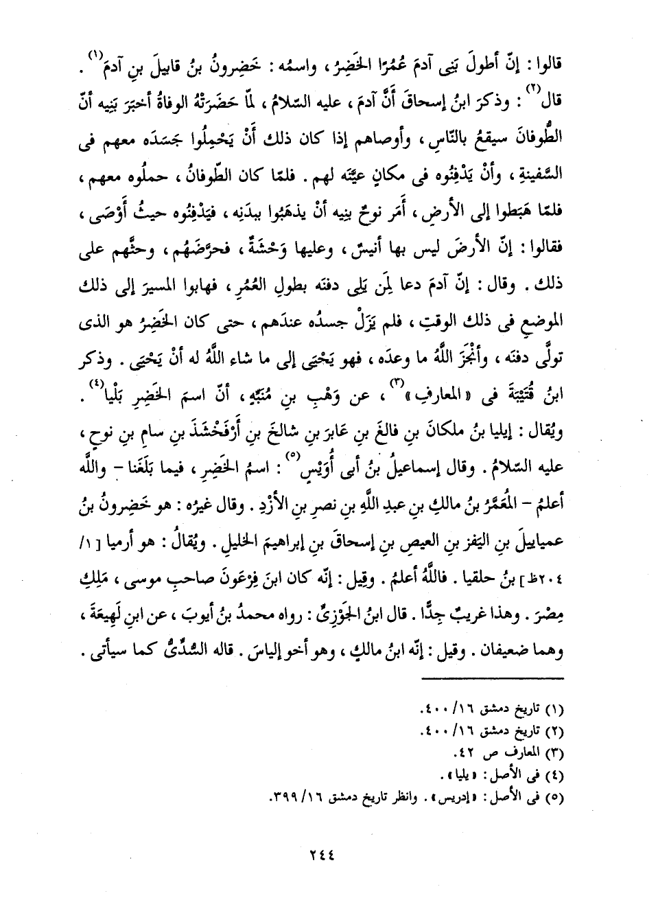 قَالُوا: إِنَّ أَطْوَلَ بَنِي آدَمَ عُمْرًا الْخَضِرُ، وَاسْمَهُ: خَضْرُونُ بْنُ قَابِيلَ بْنِ آدَمَ. قَالَ: وَذَكَرَ ابْنُ إِسْحَاقَ أَنَّ آدَمَ، عَلَيْهِ السَّلَامُ، لَمَّا حَضَرَتْهُ الْوَفَاةُ، أَخْبَرَ بَنِيهِ أَنَّ الطُّوفَانَ سَيَقَعُ بِالنَّاسِ، وَأَوْصَاهُمْ إِذَا كَانَ ذَلِكَ أَنْ يَحْمِلُوا جَسَدَهُ مَعَهُمْ فِي السَّفِينَةِ، وَأَنْ يَدْفِنُوهُ فِي مَكَانٍ عَيَّنَهُ لَهُمْ. فَلَمَّا كَانَ الطُّوفَانُ، حَمَلُوهُ مَعَهُمْ، فَلَمَّا هَبَطُوا إِلَى الْأَرْضِ، أَمَرَ نُوحٌ بَنِيهِ أَنْ يَذْهَبُوا بِبَدَنِهِ فَيَدْفِنُوهُ حَيْثُ أَوْصَى، فَقَالُوا: إِنَّ الْأَرْضَ لَيْسَ بِهَا أَنِيسٌ، وَعَلَيْهَا وَحْشَةٌ، فَحَرَّضَهُمْ، وَحَثَّهُمْ عَلَى ذَلِكَ. وَقَالَ: إِنَّ آدَمَ دَعَا لِمَنْ يَلِي دَفْنَهُ بِطُولِ الْعُمْرِ، فَهَابُوا الْمَسِيرَ إِلَى ذَلِكَ الْمَوْضِعِ فِي ذَلِكَ الْوَقْتِ، فَلَمْ يَزَلْ جَسَدُهُ عِنْدَهُمْ، حَتَّى كَانَ الْخَضِرُ هُوَ الَّذِي تَوَلَّى دَفْنَهُ، وَأَنْجَزَ اللَّهُ مَا وَعَدَهُ، فَهُوَ يَحْيَى إِلَى مَا شَاءَ اللَّهُ لَهُ أَنَّ يَحْيَى. وَذَكَرَ ابْنُ قُتَيْبَةَ فِي " الْمَعَارِفِ "، عَنْ وَهْبِ بْنِ مُنَبِّهٍ، أَنَّ اسْمَ الْخَضِرِ بَلْيَا. وَيُقَالُ: إِيلِيَا بْنُ مَلْكَانَ بْنِ فَالَغَ بْنِ عَابَرَ بْنِ شَالَخَ بْنِ أَرْفَخْشَذَ بْنِ سَامِ بْنِ نُوحٍ عَلَيْهِ السَّلَامُ. وَقَالَ إِسْمَاعِيلُ بْنُ أَبِي أُوَيْسٍ: اسْمُ الْخَضِرِ فِيمَا بَلَغْنَا - وَاللَّهُ أَعْلَمُ - الْمُعَمَّرُ بْنُ مَالِكِ بْنِ عَبْدِ اللَّهِ بْنِ نَصْرِ بْنِ الْأَزْدِ. وَقَالَ غَيْرُهُ: هُوَ خَضْرُونُ بْنُ عَمْيَايِيلَ بْنِ الْيَفْزِ بْنِ الْعِيصِ بْنِ إِسْحَاقَ بْنِ إِبْرَاهِيمَ الْخَلِيلِ. وَيُقَالُ: هُوَ أَرَمَيَا بْنُ حَلْقِيَا. فَاللَّهُ أَعْلَمُ. وَقِيلَ: إِنَّهُ كَانَ ابْنَ فِرْعَوْنَ صَاحِبِ مُوسَى، مَلِكِ مِصْرَ. وَهَذَا غَرِيبٌ جِدًّا. قَالَ ابْنُ الْجَوْزِيِّ: رَوَاهُ مُحَمَّدُ بْنُ أَيُّوبَ، عَنِ ابْنِ لَهِيعَةَ، وَهُمَا ضَعِيفَانِ. وَقِيلَ: إِنَّهُ ابْنُ مَالِكٍ، وَهُوَ أَخُو إِلْيَاسَ. قَالَهُ السُّدِّيُّ كَمَا سَيَأْتِي.