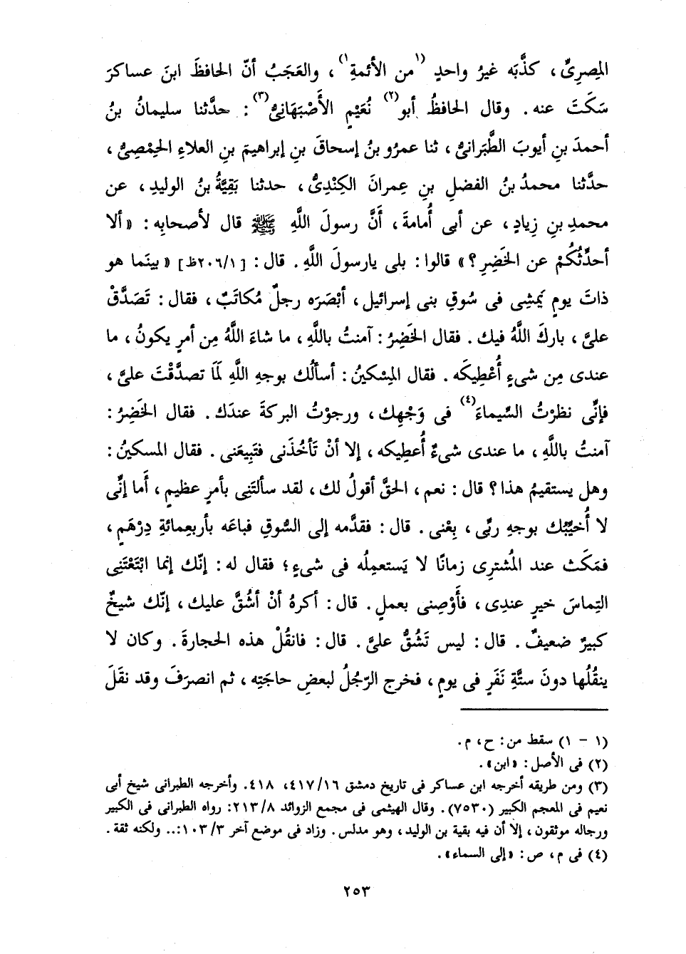 الْمِصْرِيِّ، كَذَّبَهُ غَيْرُ وَاحِدٍ مِنَ الْأَئِمَّةِ، وَالْعَجَبُ أَنَّ الْحَافِظَ ابْنَ عَسَاكِرَ سَكَتَ عَنْهُ. وَقَالَ الْحَافِظُ أَبُو نُعَيْمٍ الْأَصْبَهَانِيُّ: حَدَّثَنَا سُلَيْمَانُ بْنُ أَحْمَدَ بْنِ أَيُّوبَ الطَّبَرَانِيُّ، حَدَّثَنَا عَمْرُو بْنُ إِسْحَاقَ بْنِ إِبْرَاهِيمَ بْنِ الْعَلَاءِ الْحِمْصِيُّ، حَدَّثَنَا مُحَمَّدُ بْنُ الْفَضْلِ بْنِ عِمْرَانَ الْكِنْدِيُّ، حَدَّثَنَا بَقِيَّةُ بْنُ الْوَلِيدِ، عَنْ مُحَمَّدِ بْنِ زِيَادٍ، عَنْ أَبِي أُمَامَةَ، أَنَّ رَسُولَ اللَّهِ صَلَّى اللَّهُ عَلَيْهِ وَسَلَّمَ قَالَ لِأَصْحَابِهِ: «أَلَّا أُحَدِّثُكُمْ عَنِ الْخَضِرِ؟ قَالُوا: بَلَى يَا رَسُولَ اللَّهِ. قَالَ: بَيْنَمَا هُوَ ذَاتَ يَوْمٍ يَمْشِي فِي سُوقِ بَنِي إِسْرَائِيلَ، أَبْصَرَهُ رَجُلٌ مَكَاتَبٌ، فَقَالَ: تَصَدَّقْ عَلَيَّ بَارَكَ اللَّهُ فِيكَ. فَقَالَ الْخَضِرُ: آمَنْتُ بِاللَّهِ، مَا شَاءَ اللَّهُ مِنْ أَمْرٍ يَكُونُ، مَا عِنْدِي مِنْ شَيْءٍ أُعْطِيكَهُ. فَقَالَ الْمِسْكِينُ: أَسْأَلُكَ بِوَجْهِ اللَّهِ لَمَا تَصَدَّقْتَ عَلَيَّ، فَإِنِّي نَظَرْتُ السِّيمَاءَ فِي وَجْهِكَ، وَرَجَوْتُ الْبَرَكَةَ عِنْدَكَ. فَقَالَ الْخَضِرُ: آمَنْتُ بِاللَّهِ، مَا عِنْدِي مِنْ شَيْءٍ أُعْطِيكَهُ، إِلَّا أَنْ تَأْخُذَنِي فَتَبِيعَنِي. فَقَالَ الْمِسْكِينُ: وَهَلْ يَسْتَقِيمُ هَذَا؟ قَالَ: نَعَمْ، الْحَقَّ أَقُولُ لَكَ، لَقَدْ سَأَلْتَنِي بِأَمْرٍ عَظِيمٍ، أَمَا إِنِّي لَا أُخَيِّبُكَ بِوَجْهِ رَبِّي بِعْنِي. قَالَ: فَقَدَّمَهُ إِلَى السُّوقِ فَبَاعَهُ بِأَرْبَعِمِائَةِ دِرْهَمٍ، فَمَكَثَ عِنْدَ الْمُشْتَرِي زَمَانًا لَا يَسْتَعْمِلُهُ فِي شَيْءٍ; فَقَالَ لَهُ: إِنَّكَ إِنَّمَا ابْتَعْتَنِي الْتِمَاسَ خَيْرٍ عِنْدِي، فَأَوْصِنِي بِعَمَلٍ. قَالَ: أَكْرَهُ أَنْ أَشُقَّ عَلَيْكَ، إِنَّكَ شَيْخٌ كَبِيرٌ ضَعِيفٌ. قَالَ: لَيْسَ تَشُقُّ عَلَيَّ. قَالَ: فَانْقُلْ هَذِهِ الْحِجَارَةَ. وَكَانَ لَا يَنْقُلُهَا دُونَ سِتَّةِ نَفَرٍ فِي يَوْمٍ، فَخَرَجَ الرَّجُلُ لِبَعْضِ حَاجَتِهِ، ثُمَّ انْصَرَفَ وَقَدْ نَقَلَ