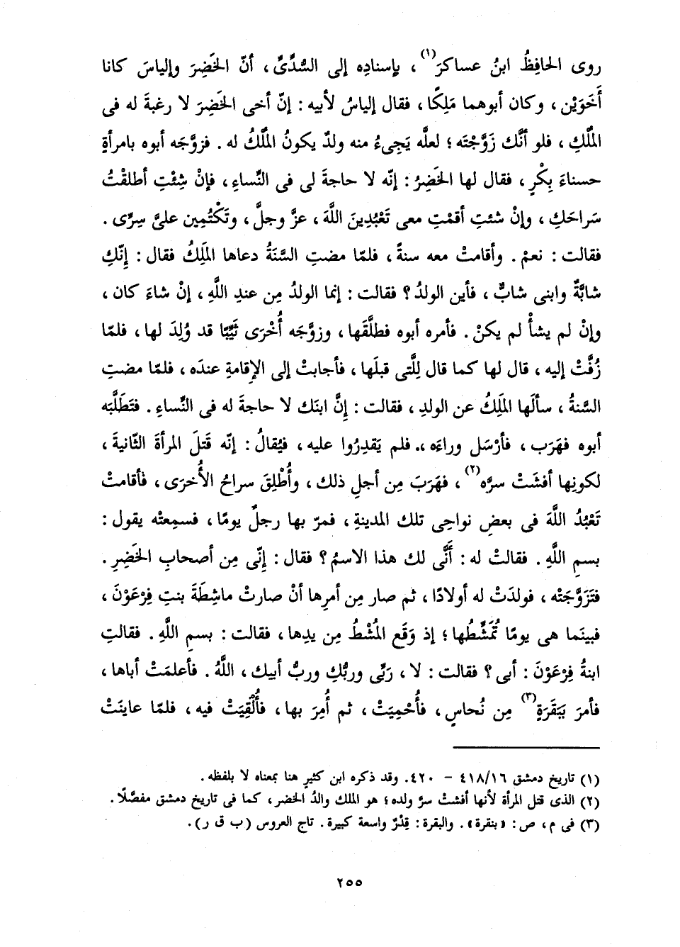 رَوَى الْحَافِظُ ابْنُ عَسَاكِرَ بِإِسْنَادِهِ إِلَى السُّدِّيُّ، أَنَّ الْخَضِرَ وَإِلْيَاسَ كَانَا أَخَوَيْنِ، وَكَانَ أَبُوهُمَا مَلِكًا، فَقَالَ إِلْيَاسُ لِأَبِيهِ: إِنَّ أَخِي الْخَضِرَ لَا رَغْبَةَ لَهُ فِي الْمُلْكِ، فَلَوْ أَنَّكَ زَوَّجْتَهُ; لَعَلَّهُ يَجِيءُ مِنْهُ وَلَدٌ يَكُونُ الْمُلْكُ لَهُ. فَزَوَّجَهُ أَبُوهُ بِامْرَأَةٍ حَسْنَاءَ بِكْرٍ، فَقَالَ لَهَا الْخَضِرُ: إِنَّهُ لَا حَاجَةَ لِي فِي النِّسَاءِ، فَإِنْ شِئْتِ أَطْلَقْتُ سَرَاحَكِ، وَإِنْ شِئْتِ أَقَمْتِ مَعِي تَعْبُدِينَ اللَّهَ، عَزَّ وَجَلَّ، وَتَكْتُمِينَ عَلَى سِرِّي. فَقَالَتْ: نَعَمْ. وَأَقَامَتْ مَعَهُ سَنَةً، فَلَمَّا مَضَتِ السَّنَةُ، دَعَاهَا الْمَلِكُ فَقَالَ: إِنَّكِ شَابَّةٌ وَابْنِي شَابٌّ، فَأَيْنَ الْوَلَدُ؟ فَقَالَتْ: إِنَّمَا الْوَلَدُ مِنْ عِنْدِ اللَّهِ، إِنْ شَاءَ كَانَ، وَإِنْ لَمْ يَشَأْ لَمْ يَكُنْ. فَأَمَرَهُ أَبُوهُ فَطَلَّقَهَا وَزَوَّجَهُ أُخْرَى ثَيِّبًا قَدْ وُلِدَ لَهَا، فَلَمَّا زُفَّتْ إِلَيْهِ قَالَ لَهَا كَمَا قَالَ لِلَّتِي قَبْلَهَا، فَأَجَابَتْ إِلَى الْإِقَامَةِ عِنْدَهُ، فَلَمَّا مَضَتِ السَّنَةُ، سَأَلَهَا الْمَلِكُ عَنِ الْوَلَدِ، فَقَالَتْ: إِنَّ ابْنَكَ لَا حَاجَةَ لَهُ فِي النِّسَاءِ. فَتَطَلَّبَهُ أَبُوهُ فَهَرَبَ، فَأَرْسَلَ وَرَاءَهُ، فَلَمْ يَقْدِرُوا عَلَيْهِ، فَيُقَالُ إِنَّهُ قَتَلَ الْمَرْأَةَ الثَّانِيَةَ، لِكَوْنِهَا أَفْشَتْ سِرَّهُ فَهَرَبَ مِنْ أَجْلِ ذَلِكَ، وَأَطْلَقَ سَرَاحَ الْأُخْرَى، فَأَقَامَتْ تَعْبُدُ اللَّهَ فِي بَعْضِ نَوَاحِي تِلْكَ الْمَدِينَةِ، فَمَرَّ بِهَا رَجُلٌ يَوْمًا، فَسَمِعْتُهُ يَقُولُ: بِسْمِ اللَّهِ. فَقَالَتْ لَهُ: أَنَّى لَكَ هَذَا الِاسْمُ؟ فَقَالَ: إِنِّي مِنْ أَصْحَابِ الْخَضِرِ. فَتَزَوَّجَتْهُ، فَوَلَدَتْ لَهُ أَوْلَادًا، ثُمَّ صَارَ مِنْ أَمْرِهَا أَنْ صَارَتْ مَاشِطَةَ بِنْتِ فِرْعَوْنَ، فَبَيْنَمَا هِيَ يَوْمًا تُمَشِّطُهَا; إِذْ وَقَعَ الْمُشْطُ مِنْ يَدِهَا، فَقَالَتْ: بِسْمِ اللَّهِ. فَقَالَتِ ابْنَةُ فِرْعَوْنَ: أَبِي؟ فَقَالَتْ: لَا، رَبِّي وَرَبُّكِ وَرَبُّ أَبِيكِ اللَّهُ. فَأَعْلَمَتْ أَبَاهَا، فَأَمَرَ بِبَقَرَةٍ مِنْ نُحَاسٍ، فَأُحْمِيَتْ، ثُمَّ أُمِرَ بِهَا، فَأُلْقِيَتْ فِيهِ، فَلَمَّا عَايَنَتْ