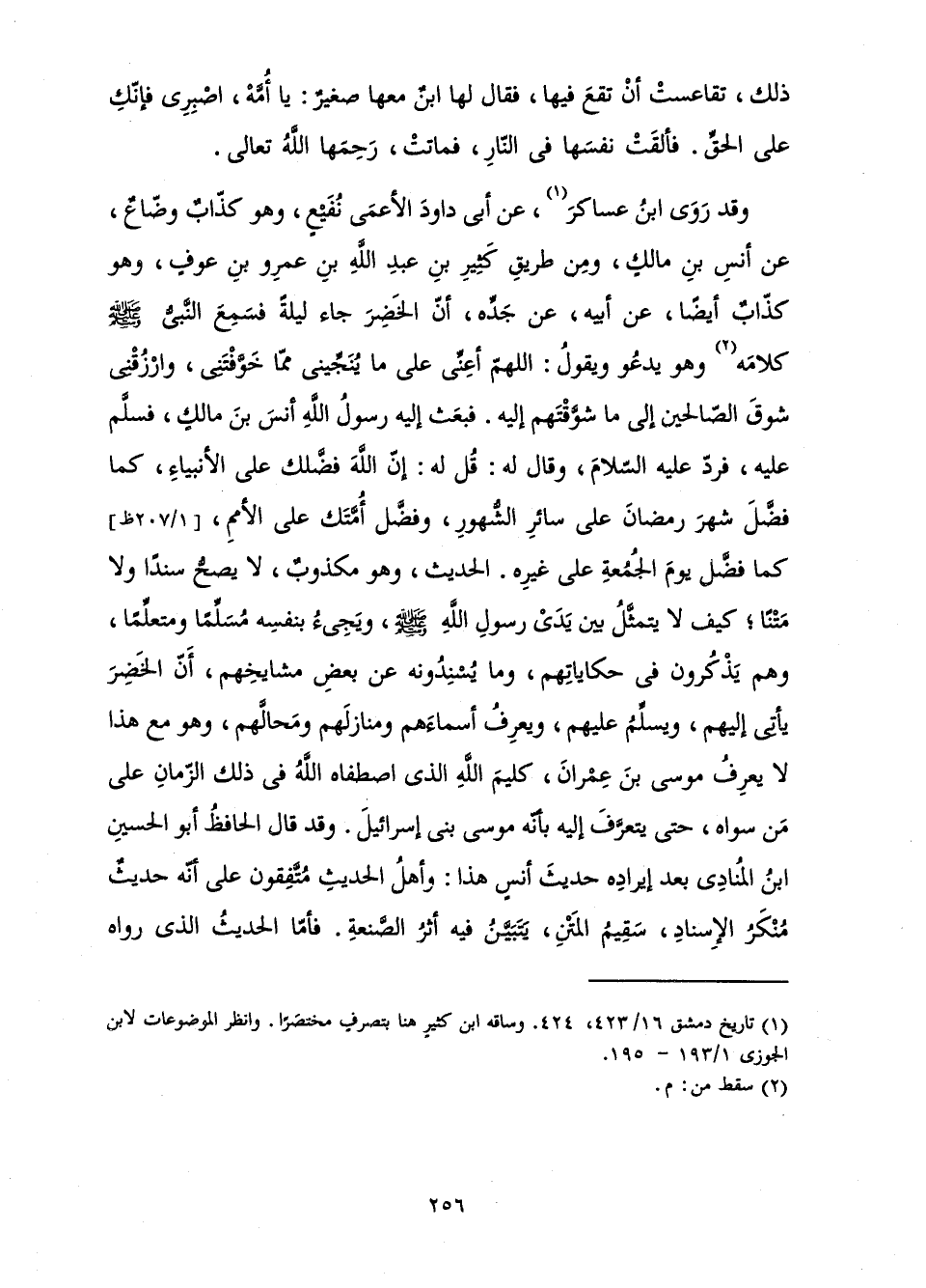 وَقَدْ رَوَى ابْنُ عَسَاكِرَ، عَنْ أَبِي دَاوُدَ الْأَعْمَى نُفَيْعٍ، وَهُوَ كَذَّابٌ وَضَّاعٌ، عَنْ أَنَسِ بْنِ مَالِكٍ، وَمِنْ طَرِيقِ كَثِيرِ بْنِ عَبْدِ اللَّهِ بْنِ عَمْرِو بْنِ عَوْفٍ، وَهُوَ كَذَّابٌ أَيْضًا، عَنْ أَبِيهِ، عَنْ جَدِّهِ، «أَنَّ الْخَضِرَ جَاءَ لَيْلَةً فَسَمِعَ النَّبِيُّ صَلَّى اللَّهُ عَلَيْهِ وَسَلَّمَ كَلَامَهُ وَهُوَ يَدْعُو وَيَقُولُ: اللَّهُمَّ أَعِنِّي عَلَى مَا يُنَجِّينِي مِمَّا خَوَّفْتَنِي، وَارْزُقْنِي شَوْقَ الصَّالِحِينَ إِلَى مَا شَوَّقَتْهُمْ إِلَيْهِ. فَبَعَثَ إِلَيْهِ رَسُولُ اللَّهِ أَنَسَ بْنَ مَالِكٍ، فَسَلَّمَ عَلَيْهِ، فَرَدَّ عَلَيْهِ السَّلَامَ، وَقَالَ لَهُ: قُلْ لَهُ: إِنَّ اللَّهَ فَضَّلَكَ عَلَى الْأَنْبِيَاءِ، كَمَا فَضَّلَ شَهْرَ رَمَضَانَ عَلَى سَائِرِ الشُّهُورِ، وَفَضَّلَ أُمَّتَكَ عَلَى الْأُمَمِ، كَمَا فَضَّلَ يَوْمَ الْجُمُعَةِ عَلَى غَيْرِهِ» . الْحَدِيثَ، وَهُوَ مَكْذُوبٌ، لَا يَصِحُّ سَنَدًا وَلَا مَتْنًا; كَيْفَ لَا يَتَمَثَّلُ بَيْنَ يَدَيْ رَسُولِ اللَّهِ صَلَّى اللَّهُ عَلَيْهِ وَسَلَّمَ وَيَجِيءُ بِنَفْسِهِ مُسَلِّمًا وَمُتَعَلِّمًا، وَهُمْ يَذْكُرُونَ فِي حِكَايَاتِهِمْ وَمَا يُسْنِدُونَهُ عَنْ بَعْضِ مَشَايِخِهِمْ، أَنَّ الْخَضِرَ يَأْتِي إِلَيْهِمْ وَيُسَلِّمُ عَلَيْهِمْ، وَيَعْرِفُ أَسْمَاءَهُمْ وَمَنَازِلَهُمْ وَمَحَالَّهُمْ، وَهُوَ مَعَ هَذَا لَا يَعْرِفُ مُوسَى بْنَ عِمْرَانَ، كَلِيمَ اللَّهِ، الَّذِي اصْطَفَاهُ اللَّهُ فِي ذَلِكَ الزَّمَانِ عَلَى مَنْ سِوَاهُ، حَتَّى يَتَعَرَّفَ إِلَيْهِ بِأَنَّهُ مُوسَى بَنِي إِسْرَائِيلَ. وَقَدْ قَالَ الْحَافِظُ أَبُو الْحُسَيْنِ بْنُ الْمُنَادَى بَعْدَ إِيرَادِهِ حَدِيثَ أَنَسٍ هَذَا: وَأَهْلُ الْحَدِيثِ مُتَّفِقُونَ عَلَى أَنَّهُ حَدِيثٌ مُنْكَرُ الْإِسْنَادِ، سَقِيمُ الْمَتْنِ، يَتَبَيَّنُ فِيهِ أَثَرُ الصَّنْعَةِ. فَأَمَّا الْحَدِيثُ الَّذِي رَوَاهُ
