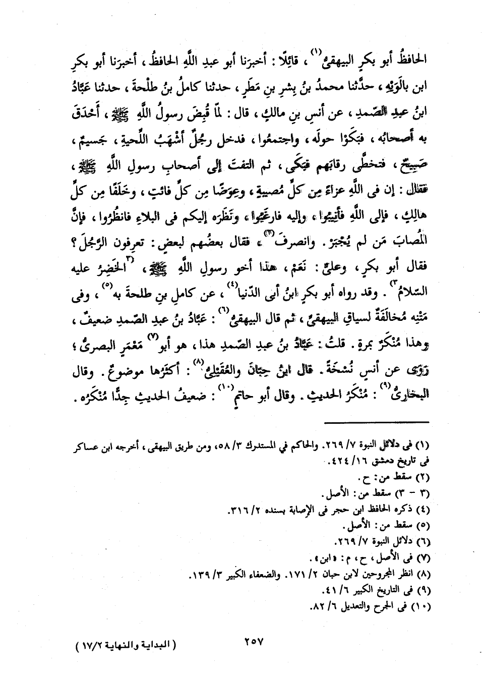 الْحَافِظُ أَبُو بَكْرٍ الْبَيْهَقِيُّ، قَائِلًا: أَخْبَرَنَا أَبُو عَبْدِ اللَّهِ الْحَافِظُ أَخْبَرَنَا أَبُو بَكْرِ بْنُ بَالَوَيْهِ، حَدَّثَنَا مُحَمَّدُ بْنُ بِشْرِ بْنِ مَطَرٍ، حَدَّثَنَا كَامِلُ بْنُ طَلْحَةَ، حَدَّثَنَا عَبَّادُ بْنُ عَبْدِ الصَّمَدِ، عَنْ أَنَسِ بْنِ مَالِكٍ، قَالَ: لَمَّا قُبِضَ رَسُولُ اللَّهِ صَلَّى اللَّهُ عَلَيْهِ وَسَلَّمَ، أَحْدَقَ بِهِ أَصْحَابُهُ، فَبَكَوْا حَوْلَهُ، وَاجْتَمَعُوا، فَدَخَلَ رَجُلٌ أَشْهَبُ اللِّحْيَةِ، جَسِيمٌ، صَبِيحٌ، فَتَخَطَّى رِقَابَهُمْ، فَبَكَى ثُمَّ الْتَفَتَ إِلَى أَصْحَابِ رَسُولِ اللَّهِ صَلَّى اللَّهُ عَلَيْهِ وَسَلَّمَ، فَقَالَ: إِنَّ فِي اللَّهِ عَزَاءً مِنْ كُلِّ مُصِيبَةٍ، وَعِوَضًا مَنْ كُلِّ فَائِتٍ، وَخَلَفًا مَنْ كُلِّ هَالِكٍ، فَإِلَى اللَّهِ فَأَنِيبُوا، وَإِلَيْهِ فَارْغَبُوا، وَنَظَرَهُ إِلَيْكُمْ فِي الْبَلَاءِ فَانْظُرُوا، فَإِنَّ الْمُصَابَ مَنْ لَمْ يُجْبَرْ. وَانْصَرَفَ، فَقَالَ بَعْضُهُمْ لِبَعْضٍ: تَعْرِفُونَ الرَّجُلَ؟ فَقَالَ أَبُو بَكْرٍ، وَعَلِيٌّ: نَعَمْ، هَذَا أَخُو رَسُولِ اللَّهِ صَلَّى اللَّهُ عَلَيْهِ وَسَلَّمَ، الْخَضِرُ عَلَيْهِ السَّلَامُ. وَقَدْ رَوَاهُ أَبُو بَكْرِ بْنُ أَبِي الدُّنْيَا، عَنْ كَامِلِ بْنِ طَلْحَةَ بِهِ، وَفِي مَتْنِهِ مُخَالَفَةٌ لِسِيَاقِ الْبَيْهَقِيِّ، ثُمَّ قَالَ الْبَيْهَقِيُّ: عَبَّادُ بْنُ عَبْدِ الصَّمَدِ ضَعِيفٌ، وَهَذَا مُنْكَرٌ بِمَرَّةٍ. قُلْتُ: عَبَّادُ بْنُ عَبْدِ الصَّمَدِ هَذَا، هُوَ ابْنِ مَعْمَرٍ الْبَصْرِيِّ، رَوَى عَنْ أَنَسٍ نُسْخَةً. قَالَ ابْنُ حِبَّانَ وَالْعُقَيْلِيُّ: أَكْثَرُهَا مَوْضُوعٌ. وَقَالَ الْبُخَارِيُّ: مُنْكَرُ الْحَدِيثِ. وَقَالَ أَبُو حَاتِمٍ: ضَعِيفُ الْحَدِيثِ جِدًّا مُنْكَرُهُ.