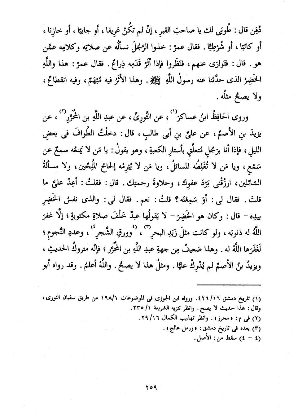 دُفِنَ قَالَ: طُوبَى لَكَ يَا صَاحِبَ الْقَبْرِ، إِنْ لَمْ تَكُنْ عَرِيفًا، أَوْ جَابِيًا، أَوْ خَازِنًا، أَوْ كَاتِبًا، أَوْ شُرْطِيًّا. فَقَالَ عُمَرُ: خُذُوا الرَّجُلَ نَسْأَلْهُ عَنْ صَلَاتِهِ وَكَلَامِهِ عَمَّنْ هُوَ. قَالَ: فَتَوَارَى عَنْهُمْ، فَنَظَرُوا فَإِذَا أَثَرُ قَدَمِهِ ذِرَاعٌ. فَقَالَ عُمَرُ: هَذَا وَاللَّهِ الْخَضِرُ الَّذِي حَدَّثَنَا عَنْهُ رَسُولُ اللَّهِ صَلَّى اللَّهُ عَلَيْهِ وَسَلَّمَ. وَهَذَا الْأَثَرُ فِيهِ مُبْهَمٌ، وَفِيهِ انْقِطَاعٌ، وَلَا يَصِحُّ مَثَلُهُ.