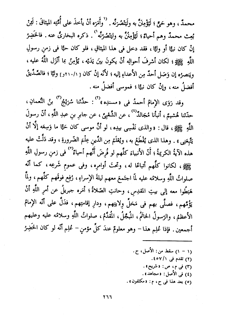 وَقَدْ رَوَى الْإِمَامُ أَحْمَدُ فِي " مُسْنَدِهِ ": حَدَّثَنَا سُرَيْجُ بْنُ النُّعْمَانِ، حَدَّثَنَا هُشَيْمٌ، أَنْبَأَنَا مُجَالِدٌ، عَنِ الشَّعْبِيِّ، عَنْ جَابِرِ بْنِ عَبْدِ اللَّهِ، أَنَّ رَسُولَ اللَّهِ صَلَّى اللَّهُ عَلَيْهِ وَسَلَّمَ، قَالَ: «وَالَّذِي نَفْسِي بِيَدِهِ، لَوْ أَنَّ مُوسَى كَانَ حَيًّا مَا وَسِعَهُ إِلَّا أَنْ يَتَّبِعَنِي» وَهَذَا الَّذِي يُقْطَعُ بِهِ وَيَعْلَمُ مِنَ الدِّينِ عِلْمَ الضَّرُورَةِ، وَقَدْ دَلَّتْ عَلَيْهِ هَذِهِ الْآيَةُ الْكَرِيمَةُ; أَنَّ الْأَنْبِيَاءَ كُلَّهُمْ لَوْ فُرِضَ أَنَّهُمْ أَحْيَاءٌ مُكَلَّفُونَ فِي زَمَنِ رَسُولِ اللَّهِ صَلَّى اللَّهُ عَلَيْهِ وَسَلَّمَ، لَكَانُوا كُلُّهُمْ أَتْبَاعًا لَهُ، وَتَحْتَ أَوَامِرِهِ، وَفِي عُمُومِ شَرْعِهِ، كَمَا أَنَّهُ صَلَوَاتُ اللَّهِ وَسَلَامُهُ عَلَيْهِ لَمَّا اجْتَمَعَ مَعَهُمْ لَيْلَةَ الْإِسْرَاءِ، رُفِعَ فَوْقَهُمْ كُلِّهِمْ، وَلَمَّا هَبَطُوا مَعَهُ إِلَى بَيْتِ الْمَقْدِسِ، وَحَانَتِ الصَّلَاةُ; أَمَرَهُ جِبْرِيلُ عَنْ أَمْرِ اللَّهِ أَنْ يَؤُمَّهُمْ، فَصَلَّى بِهِمْ فِي مَحَلِّ وِلَايَتِهِمْ، وَدَارِ إِقَامَتِهِمْ، فَدَلَّ عَلَى أَنَّهُ الْإِمَامُ الْأَعْظَمُ، وَالرَّسُولُ الْخَاتَمُ الْمُبَجَّلُ الْمُقَدَّمُ، صَلَوَاتُ اللَّهِ وَسَلَامُهُ عَلَيْهِ وَعَلَيْهِمْ أَجْمَعِينَ. فَإِذَا عُلِمَ هَذَا - وَهُوَ مَعْلُومٌ عِنْدَ كُلِّ مُؤْمِنٍ - عُلِمَ أَنَّهُ لَوْ كَانَ الْخَضِرُ