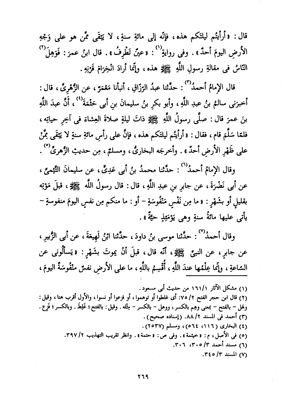 قَالَ: «أَرَأَيْتُمْ لَيْلَتَكُمْ هَذِهِ، فَإِنَّهُ إِلَى مِائَةٍ سَنَةٍ، لَا يَبْقَى مِمَّنْ هُوَ عَلَى وَجْهِ الْأَرْضِ الْيَوْمَ أَحَدٌ - وَفِي رِوَايَةٍ: - عَيْنٌ تَطْرِفُ» قَالَ ابْنُ عُمَرَ: فَوَهِلَ النَّاسُ فِي مَقَالَةِ رَسُولِ اللَّهِ صَلَّى اللَّهُ عَلَيْهِ وَسَلَّمَ هَذِهِ، وَإِنَّمَا أَرَادَ انْخِرَامَ قَرْنِهِ.