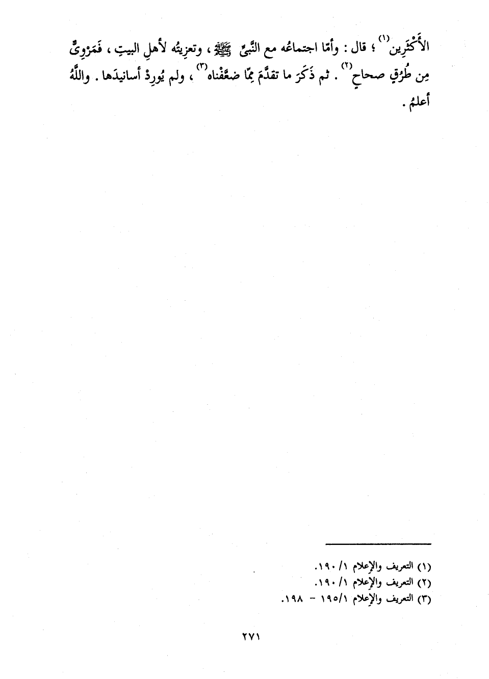الْأَكْثَرِينَ; قَالَ: وَأَمَّا اجْتِمَاعُهُ مَعَ النَّبِيِّ صَلَّى اللَّهُ عَلَيْهِ وَسَلَّمَ، وَتَعْزِيَتُهُ لِأَهْلِ الْبَيْتِ، بَعْدَهُ فَمَرْوِيٌّ مِنْ طُرُقٍ صِحَاحٍ. ثُمَّ ذَكَرَ مَا تَقَدَّمَ مِمَّا ضَعَّفْنَاهُ، وَلَمْ يُورِدْ أَسَانِيدَهَا. وَاللَّهُ أَعْلَمُ.