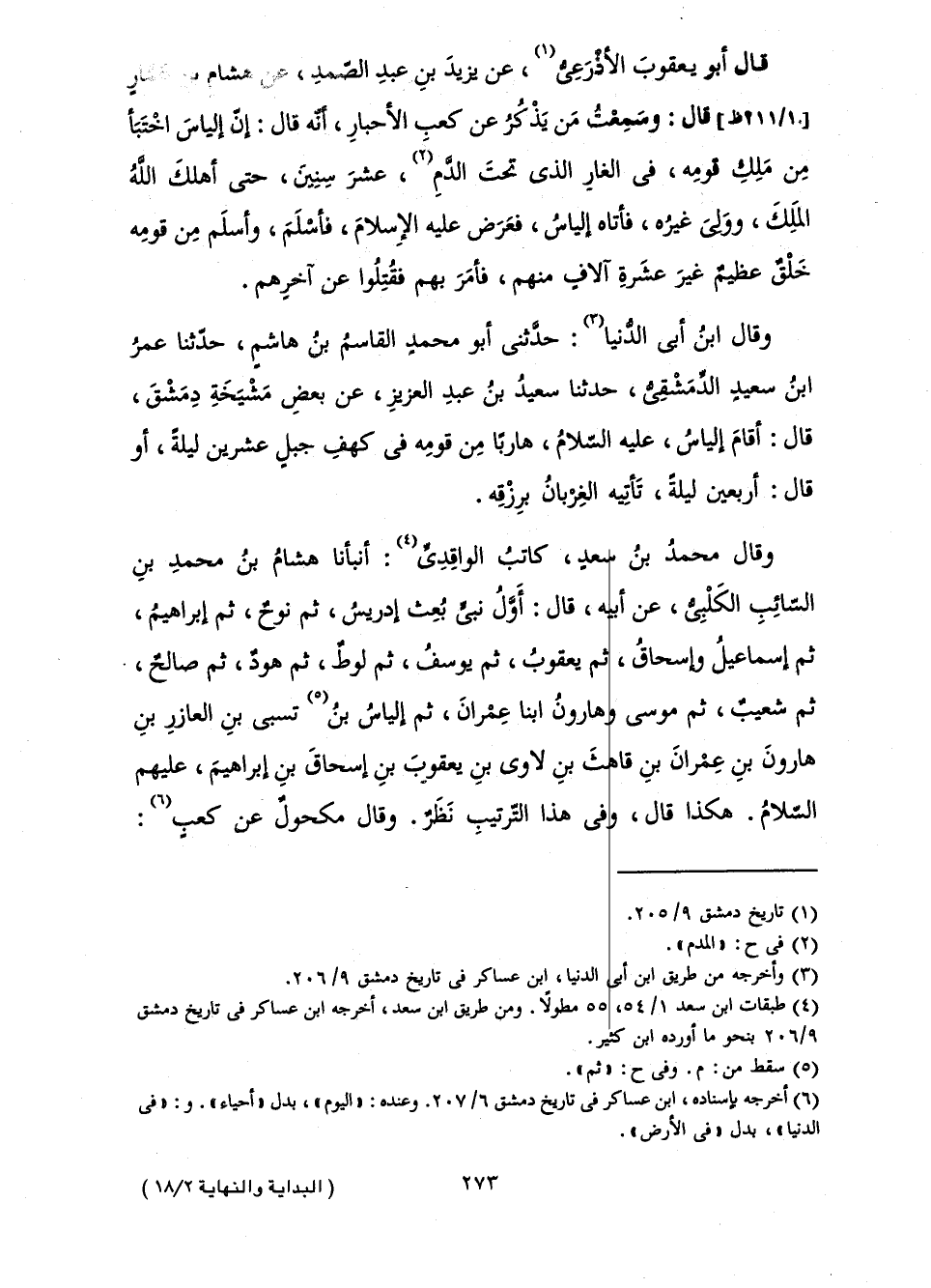 وَقَالَ مُحَمَّدُ بْنُ سَعْدٍ، كَاتِبُ الْوَاقِدِيِّ: أَنْبَأَنَا هِشَامُ بْنُ مُحَمَّدِ بْنِ السَّائِبِ الْكَلْبِيُّ، عَنْ أَبِيهِ، قَالَ: أَوَّلُ نَبِيٍّ بُعِثَ إِدْرِيسُ، ثُمَّ نُوحٌ، ثُمَّ إِبْرَاهِيمُ، ثُمَّ إِسْمَاعِيلُ وَإِسْحَاقُ، ثُمَّ يَعْقُوبُ، ثُمَّ يُوسُفُ، ثُمَّ لُوطٌ، ثُمَّ هُودٌ، ثُمَّ صَالِحٌ، ثُمَّ شُعَيْبٌ، ثُمَّ مُوسَى وَهَارُونُ، ابْنَا عِمْرَانَ، ثُمَّ إِلْيَاسُ بْنُ تَسْبِي بْنِ الْعَازِرِ بْنِ هَارُونَ بْنِ عِمْرَانَ بْنِ قَاهَثَ بْنِ لَاوِي بْنِ يَعْقُوبَ بْنِ إِسْحَاقَ بْنِ إِبْرَاهِيمَ، عَلَيْهِمُ السَّلَامُ. هَكَذَا قَالَ، وَفِي هَذَا التَّرْتِيبِ نَظَرٌ. وَقَالَ مَكْحُولٌ عَنْ كَعْبٍ: