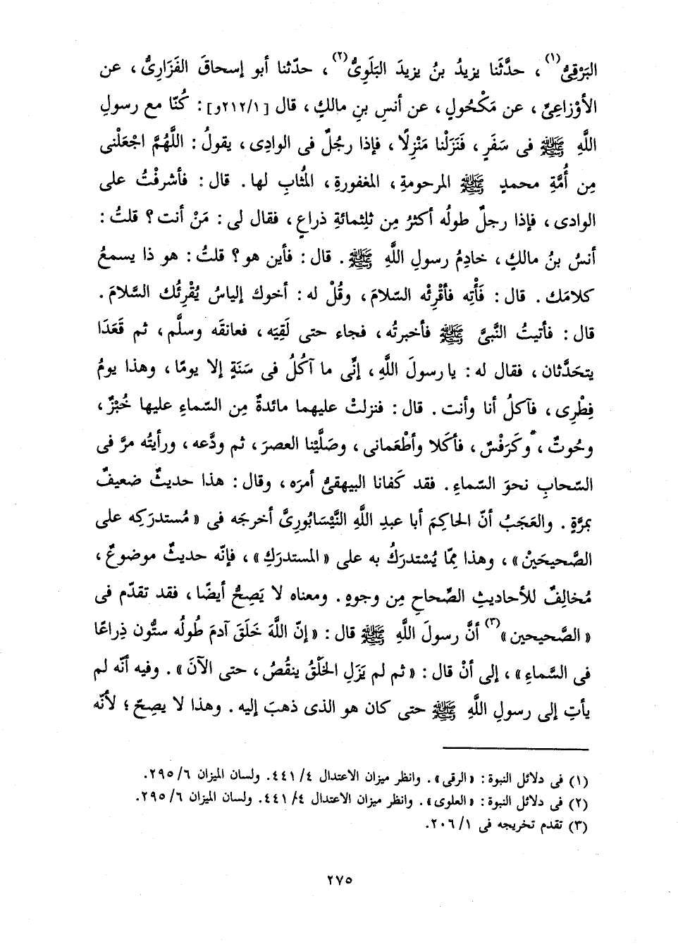 الْبَرْقِيُّ، حَدَّثَنَا يَزِيدُ بْنُ يَزِيدَ الْبَلَوِيُّ، حَدَّثَنَا أَبُو إِسْحَاقَ الْفَزَارِيُّ، عَنِ الْأَوْزَاعِيِّ، عَنْ مَكْحُولٍ، عَنْ أَنَسِ بْنِ مَالِكٍ، قَالَ: «كُنَّا مَعَ رَسُولِ اللَّهِ صَلَّى اللَّهُ عَلَيْهِ وَسَلَّمَ فِي سَفَرٍ، فَنَزَلْنَا مَنْزِلًا، فَإِذَا رَجُلٌ فِي الْوَادِي يَقُولُ: اللَّهُمَّ اجْعَلْنِي مِنْ أُمَّةِ مُحَمَّدٍ صَلَّى اللَّهُ عَلَيْهِ وَسَلَّمَ الْمَرْحُومَةِ، الْمَغْفُورَةِ، الْمُثَابِ لَهَا. قَالَ: فَأَشْرَفْتُ عَلَى الْوَادِي، فَإِذَا رَجُلٌ طُولُهُ أَكْثَرُ مِنْ ثَلَاثِمِائَةِ ذِرَاعٍ، فَقَالَ لِي: مَنْ أَنْتَ؟ قُلْتُ: أَنَسُ بْنُ مَالِكٍ، خَادِمُ رَسُولِ اللَّهِ صَلَّى اللَّهُ عَلَيْهِ وَسَلَّمَ. قَالَ: فَأَيْنَ هُوَ؟ قُلْتُ: هُوَ ذَا يَسْمَعُ كَلَامَكَ. قَالَ: فَأْتِهِ فَأَقْرِئْهُ السَّلَامَ، وَقُلْ لَهُ: أَخُوكَ إِلْيَاسُ يُقْرِئُكَ السَّلَامَ. قَالَ: فَأَتَيْتُ النَّبِيَّ صَلَّى اللَّهُ عَلَيْهِ وَسَلَّمَ فَأَخْبَرَتْهُ فَجَاءَ حَتَّى لَقِيَهُ، فَعَانَقَهُ وَسَلَّمَ، ثُمَّ قَعَدَا يَتَحَدَّثَانِ، فَقَالَ لَهُ: يَا رَسُولَ اللَّهِ، إِنِّي مَا آكُلُ فِي سَنَةٍ إِلَّا يَوْمًا، وَهَذَا يَوْمُ فِطْرِي، فَآكُلُ أَنَا وَأَنْتَ. قَالَ: فَنَزَلَتْ عَلَيْهِمَا مَائِدَةٌ مِنَ السَّمَاءِ عَلَيْهَا خُبْزٌ، وَحُوتٌ، وَكَرَفْسٌ، فَأَكَلَا وَأَطْعَمَانِي، وَصَلَّيْنَا الْعَصْرَ، ثُمَّ وَدَّعَهُ، وَرَأَيْتُهُ مَرَّ فِي السَّحَابِ نَحْوَ السَّمَاءِ» . فَقَدْ كَفَانَا الْبَيْهَقِيُّ أَمْرَهُ وَقَالَ: هَذَا حَدِيثٌ ضَعِيفٌ بِمَرَّةٍ. وَالْعَجَبُ أَنَّ الْحَاكِمَ أَبَا عَبْدِ اللَّهِ النَّيْسَابُورِيَّ أَخْرَجَهُ فِي " مُسْتَدْرِكِهِ عَلَى الصَّحِيحَيْنِ "، وَهَذَا مِمَّا يُسْتَدْرَكُ بِهِ عَلَى " الْمُسْتَدْرَكِ "، فَإِنَّهُ حَدِيثٌ مَوْضُوعٌ، مُخَالِفٌ لِلْأَحَادِيثِ الصِّحَاحِ، مِنْ وُجُوهٍ. وَمَعْنَاهُ لَا يَصِحُّ أَيْضًا، فَقَدْ تَقَدَّمَ فِي " الصَّحِيحَيْنِ "، أَنَّ رَسُولَ اللَّهِ صَلَّى اللَّهُ عَلَيْهِ وَسَلَّمَ، قَالَ: «إِنَّ اللَّهَ خَلَقَ آدَمَ طُولُهُ سِتُّونَ ذِرَاعًا فِي السَّمَاءِ» إِلَى أَنْ قَالَ: «ثُمَّ لَمْ يَزَلِ الْخَلْقُ يَنْقُصُ، حَتَّى الْآنَ» وَفِيهِ أَنَّهُ لَمْ يَأْتِ إِلَى رَسُولِ اللَّهِ صَلَّى اللَّهُ عَلَيْهِ وَسَلَّمَ حَتَّى كَانَ هُوَ الَّذِي ذَهَبَ إِلَيْهِ. وَهَذَا لَا يَصِحُّ; لِأَنَّهُ