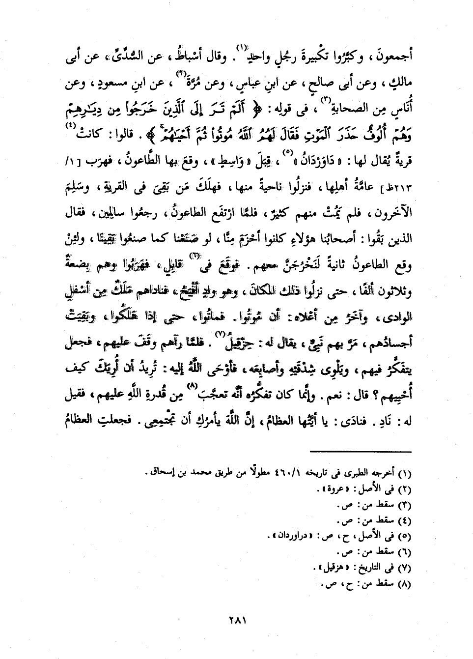 أَجْمَعُونَ، وَكَبَّرُوا تَكْبِيرَةَ رَجُلٍ وَاحِدٍ. وَقَالَ أَسْبَاطٌ، عَنِ السُّدِّيِّ، عَنْ أَبِي مَالِكٍ، وَعَنْ أَبِي صَالِحٍ، عَنِ ابْنِ عَبَّاسٍ، وَعَنْ مُرَّةَ، عَنِ ابْنِ مَسْعُودٍ، وَعَنْ أُنَاسٍ مِنَ الصَّحَابَةِ، فِي قَوْلِهِ: {أَلَمْ تَرَ إِلَى الَّذِينَ خَرَجُوا مِنْ دِيَارِهِمْ وَهُمْ أُلُوفٌ حَذَرَ الْمَوْتِ فَقَالَ لَهُمُ اللَّهُ مُوتُوا ثُمَّ أَحْيَاهُمْ} [البقرة: 243] قَالُوا: كَانَتْ قَرْيَةٌ يُقَالُ لَهَا: " دَاوَرْدَانُ "، قِبَلَ " وَاسِطَ " وَقَعَ بِهَا الطَّاعُونُ فَهَرَبَ عَامَّةُ أَهْلِهَا، فَنَزَلُوا نَاحِيَةً مِنْهَا، فَهَلَكَ مَنْ بَقِيَ فِي الْقَرْيَةِ، وَسَلِمَ الْآخَرُونَ، فَلَمْ يَمُتْ مِنْهُمْ كَثِيرٌ، فَلَمَّا ارْتَفَعَ الطَّاعُونُ، رَجَعُوا سَالِمِينَ، فَقَالَ الَّذِينَ بَقُوا: أَصْحَابُنَا هَؤُلَاءِ كَانُوا أَحْزَمَ مِنَّا، لَوْ صَنَعْنَا كَمَا صَنَعُوا بَقِينَا، وَلَئِنْ وَقَعَ الطَّاعُونُ ثَانِيَةً لَنَخْرُجَنَّ مَعَهُمْ. فَوَقَعَ فِي قَابِلٍ، فَهَرَبُوا وَهُمْ بِضْعَةٌ وَثَلَاثُونَ أَلْفًا، حَتَّى نَزَلُوا ذَلِكَ الْمَكَانَ، وَهُوَ وَادٍ أَفْيَحُ، فَنَادَاهُمْ مَلَكٌ مِنْ أَسْفَلِ الْوَادِي، وَآخَرُ مِنْ أَعْلَاهُ: أَنْ مُوتُوا. فَمَاتُوا، حَتَّى إِذَا هَلَكُوا، وَبَقِيَتْ أَجْسَادُهُمْ، مَرَّ بِهِمْ نَبِيٌّ، يُقَالُ لَهُ: حِزْقِيلُ. فَلَمَّا رَآهُمْ وَقَفَ عَلَيْهِمْ، فَجَعَلَ يَتَفَكَّرُ فِيهِمْ وَيَلْوِي شِدْقَيْهِ وَأَصَابِعَهُ، فَأَوْحَى اللَّهُ إِلَيْهِ: تُرِيدُ أَنْ أُرِيَكَ كَيْفَ أُحْيِيهِمْ؟ قَالَ: نَعَمْ. وَإِنَّمَا كَانَ تَفَكُّرُهُ أَنَّهُ تَعَجَّبَ مِنْ قُدْرَةِ اللَّهِ عَلَيْهِمْ، فَقِيلَ لَهُ: نَادِ. فَنَادَى: يَا أَيَّتُهَا الْعِظَامُ، إِنَّ اللَّهَ يَأْمُرُكِ أَنْ تَجْتَمِعِي. فَجَعَلَتِ الْعِظَامُ