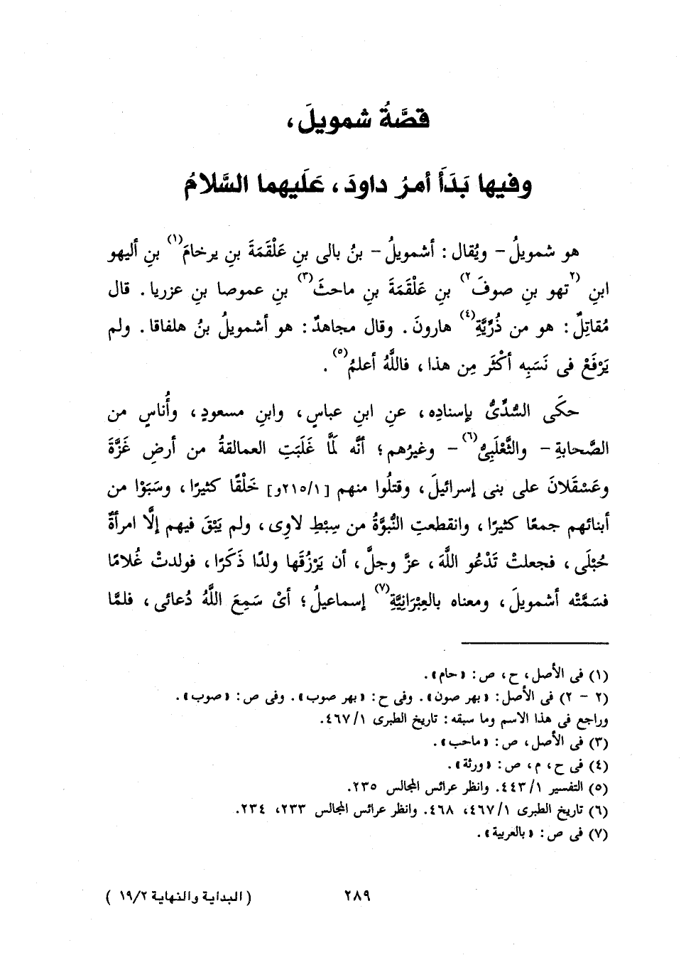 حَكَى السُّدِّيُّ بِإِسْنَادِهِ، عَنِ ابْنِ عَبَّاسٍ، وَابْنِ مَسْعُودٍ، وَأُنَاسٍ مِنَ الصَّحَابَةِ - وَالثَّعْلَبِيِّ - وَغَيْرِهِمْ; أَنَّهُ لَمَّا غَلَبَتِ الْعَمَالِقَةُ مِنْ أَرْضِ غَزَّةَ وَعَسْقَلَانَ عَلَى بَنِي إِسْرَائِيلَ، وَقَتَلُوا مِنْهُمْ خَلْقًا كَثِيرًا، وَسَبَوْا مِنْ أَبْنَائِهِمْ جَمْعًا كَثِيرًا، وَانْقَطَعَتِ النُّبُوَّةُ مِنْ سِبْطِ لَاوِي، وَلَمْ يَبْقَ فِيهِمْ إِلَّا امْرَأَةٌ حُبْلَى، فَجَعَلَتْ تَدْعُو اللَّهَ عَزَّ وَجَلَّ أَنْ يَرْزُقَهَا وَلَدًا ذَكَرًا، فَوَلَدَتْ غُلَامًا فَسَمَّتْهُ أَشْمَوِيلَ، وَمَعْنَاهُ بِالْعِبْرَانِيَّةِ إِسْمَاعِيلُ; أَيْ سَمْعِ اللَّهُ دُعَائِي، فَلَمَّا