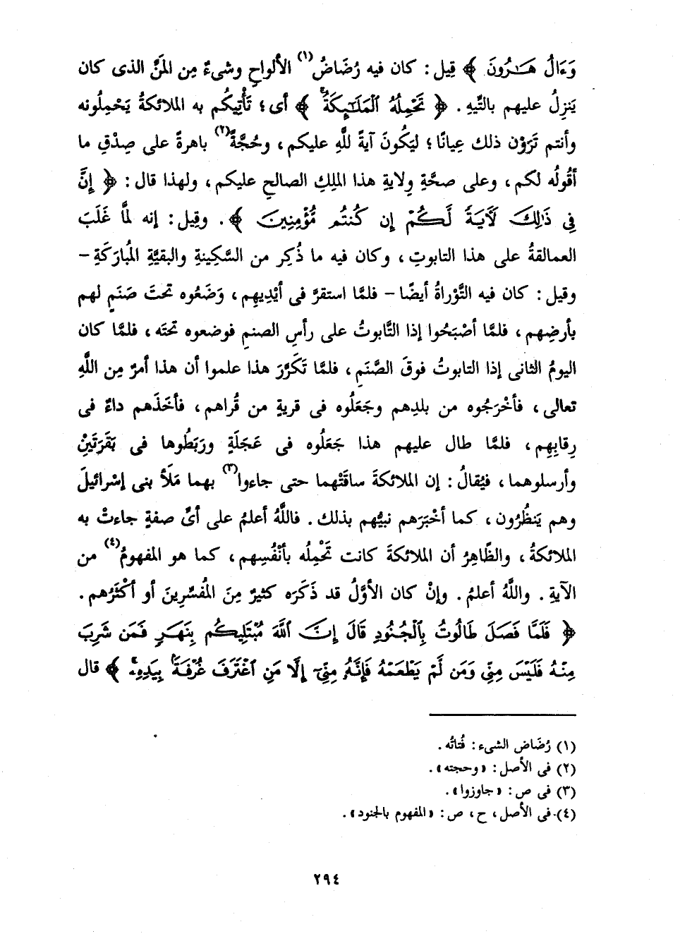 قِيلَ: كَانَ فِيهِ رُضَاضُ الْأَلْوَاحِ وَشَيْءٌ مِنَ الْمَنِّ الَّذِي كَانَ يَنْزِلُ عَلَيْهِمْ بِالتِّيهِ. {تَحْمِلُهُ الْمَلَائِكَةُ} [البقرة: 248] أَيْ; تَأْتِيكُمْ بِهِ الْمَلَائِكَةُ يَحْمِلُونَهُ وَأَنْتُمْ تَرَوْنَ ذَلِكَ عِيَانًا; لِيَكُونَ آيَةً لِلَّهِ عَلَيْكُمْ وَحُجَّةً بَاهِرَةً عَلَى صِدْقِ مَا أَقُولُهُ لَكُمْ، وَعَلَى صِحَّةِ وِلَايَةِ هَذَا الْمَلِكِ الصَّالِحِ عَلَيْكُمْ، وَلِهَذَا قَالَ: {إِنَّ فِي ذَلِكَ لَآيَةً لَكُمْ إِنْ كُنْتُمْ مُؤْمِنِينَ} [البقرة: 248] وَقِيلَ: إِنَّهُ لَمَّا غَلَبَ الْعَمَالِقَةُ عَلَى هَذَا التَّابُوتِ، وَكَانَ فِيهِ مَا ذُكِرَ مِنَ السِّكِّينَةِ وَالْبَقِيَّةِ الْمُبَارَكَةِ - وَقِيلَ: كَانَ فِيهِ التَّوْرَاةُ أَيْضًا - فَلَمَّا اسْتَقَرَّ فِي أَيْدِيهِمْ وَضَعُوهُ تَحْتَ صَنَمٍ لَهُمْ بِأَرْضِهِمْ، فَلَمَّا أَصْبَحُوا إِذَا التَّابُوتُ عَلَى رَأْسِ الصَّنَمِ فَوَضَعُوهُ تَحْتَهُ، فَلَمَّا كَانَ الْيَوْمُ الثَّانِي إِذَا التَّابُوتُ فَوْقَ الصَّنَمِ، فَلَمَّا تَكَرَّرَ هَذَا عَلِمُوا أَنَّ هَذَا أَمْرٌ مِنَ اللَّهِ تَعَالَى فَأَخْرَجُوهُ مِنْ بَلَدِهِمْ، وَجَعَلُوهُ فِي قَرْيَةٍ مِنْ قُرَاهُمْ، فَأَخَذَهُمْ دَاءٌ فِي رِقَابِهِمْ، فَلَمَّا طَالَ عَلَيْهِمْ هَذَا جَعَلُوهُ فِي عَجَلَةٍ وَرَبَطُوهَا فِي بَقَرَتَيْنِ وَأَرْسَلُوهُمَا، فَيُقَالُ: إِنَّ الْمَلَائِكَةَ سَاقَتْهُمَا حَتَّى جَاءُوا بِهِمَا مَلَأَ بَنِي إِسْرَائِيلَ وَهُمْ يَنْظُرُونَ، كَمَا أَخْبَرَهُمْ نَبِيُّهُمْ بِذَلِكَ. فَاللَّهُ أَعْلَمُ عَلَى أَيِّ صِفَةٍ جَاءَتْ بِهِ الْمَلَائِكَةُ، وَالظَّاهِرُ أَنَّ الْمَلَائِكَةَ كَانَتْ تَحْمِلُهُ بِأَنْفُسِهِمْ، كَمَا هُوَ الْمَفْهُومُ مِنَ الْآيَةِ. وَاللَّهُ أَعْلَمُ. وَإِنْ كَانَ الْأَوَّلُ قَدْ ذَكَرَهُ كَثِيرٌ مِنَ الْمُفَسِّرِينَ أَوْ أَكْثَرُهُمْ. {فَلَمَّا فَصَلَ طَالُوتُ بِالْجُنُودِ قَالَ إِنَّ اللَّهَ مُبْتَلِيكُمْ بِنَهَرٍ فَمَنْ شَرِبَ مِنْهُ فَلَيْسَ مِنِّي وَمَنْ لَمْ يَطْعَمْهُ فَإِنَّهُ مِنِّي إِلَّا مَنِ اغْتَرَفَ غُرْفَةً بِيَدِهِ} [البقرة: 249] قَالَ