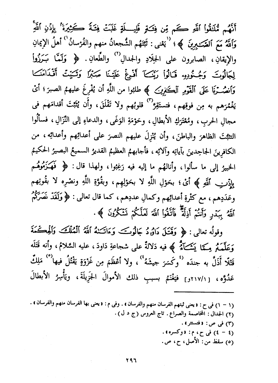 ; يَعْنِي: ثَبَّتَهُمُ الشُّجْعَانُ مِنْهُمْ وَالْفُرْسَانُ أَهْلُ الْإِيمَانِ وَالْإِيقَانِ، الصَّابِرُونَ عَلَى الْجِلَادِ وَالْجِدَالِ وَالطِّعَانِ. {وَلَمَّا بَرَزُوا لِجَالُوتَ وَجُنُودِهِ قَالُوا رَبَّنَا أَفْرِغْ عَلَيْنَا صَبْرًا وَثَبِّتْ أَقْدَامَنَا وَانْصُرْنَا عَلَى الْقَوْمِ الْكَافِرِينَ} [البقرة: 250] طَلَبُوا مِنَ اللَّهِ أَنْ يُفْرِغَ عَلَيْهِمُ الصَّبْرَ; أَيْ يَغْمُرَهُمْ بِهِ مِنْ فَوْقِهِمْ، فَتَسْتَقِرَّ قُلُوبُهُمْ وَلَا تَقْلَقَ، وَأَنْ يُثَبِّتَ أَقْدَامَهُمْ فِي مَجَالِ الْحَرْبِ، وَمُعْتَرَكِ الْأَبْطَالِ، وَحَوْمَةِ الْوَغَى، وَالدُّعَاءِ إِلَى النِّزَالِ، فَسَأَلُوا التَّثَبُّتَ الظَّاهِرَ وَالْبَاطِنَ، وَأَنْ يُنْزِلَ عَلَيْهِمُ النَّصْرَ عَلَى أَعْدَائِهِمْ وَأَعْدَائِهِ، مِنَ الْكَافِرِينَ الْجَاحِدِينَ بِآيَاتِهِ وَآلَائِهِ، فَأَجَابَهُمُ الْعَظِيمُ الْقَدِيرُ السَّمِيعُ الْبَصِيرُ الْحَكِيمُ الْخَبِيرُ إِلَى مَا سَأَلُوا وَأَنَالَهُمْ مَا إِلَيْهِ فِيهِ رَغِبُوا وَلِهَذَا قَالَ: {فَهَزَمُوهُمْ بِإِذْنِ اللَّهِ} [البقرة: 251] أَيْ; بِحَوْلِ اللَّهِ لَا بِحَوْلِهِمْ، وَبِقُوَّةِ اللَّهِ وَنَصْرِهِ لَا بِقُوَّتِهِمْ وَعَدَدِهِمْ، مَعَ كَثْرَةِ أَعْدَائِهِمْ وَكَمَالِ عَدَدِهِمْ، كَمَا قَالَ تَعَالَى: {وَلَقَدْ نَصَرَكُمُ اللَّهُ بِبَدْرٍ وَأَنْتُمْ أَذِلَّةٌ فَاتَّقُوا اللَّهَ لَعَلَّكُمْ تَشْكُرُونَ} [آل عمران: 123] .