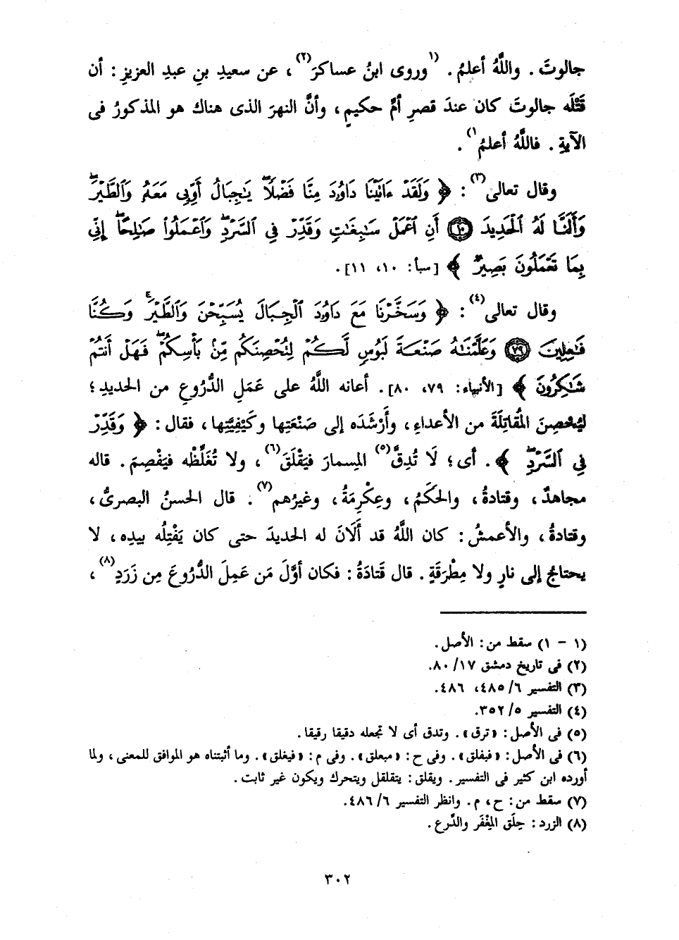 وَقَالَ تَعَالَى: {وَسَخَّرْنَا مَعَ دَاوُدَ الْجِبَالَ يُسَبِّحْنَ وَالطَّيْرَ وَكُنَّا فَاعِلِينَ وَعَلَّمْنَاهُ صَنْعَةَ لَبُوسٍ لَكُمْ لِتُحْصِنَكُمْ مِنْ بَأْسِكُمْ فَهَلْ أَنْتُمْ شَاكِرُونَ} [الأنبياء: 79] أَيْ: لَا تُدِقَّ الْمِسْمَارَ فَيَقْلَقَ، وَلَا تُغَلِّظْهُ فَيَفْصِمَ. قَالَهُ مُجَاهِدٌ، وَقَتَادَةُ، وَالْحَكَمُ، وَعِكْرِمَةُ، وَغَيْرُهُمْ. قَالَ الْحَسَنُ الْبَصْرِيُّ، وَقَتَادَةُ، وَالْأَعْمَشُ: كَانَ اللَّهُ قَدْ أَلَانَ لَهُ الْحَدِيدَ حَتَّى كَانَ يَفْتِلُهُ بِيَدِهِ، لَا يَحْتَاجُ إِلَى نَارٍ وَلَا مِطْرَقَةٍ. قَالَ قَتَادَةُ: فَكَانَ أَوَّلَ مَنْ عَمِلَ الدُّرُوعَ مِنْ زَرَدٍ،
